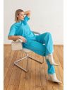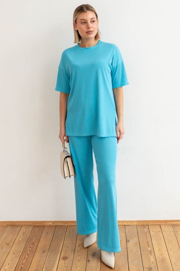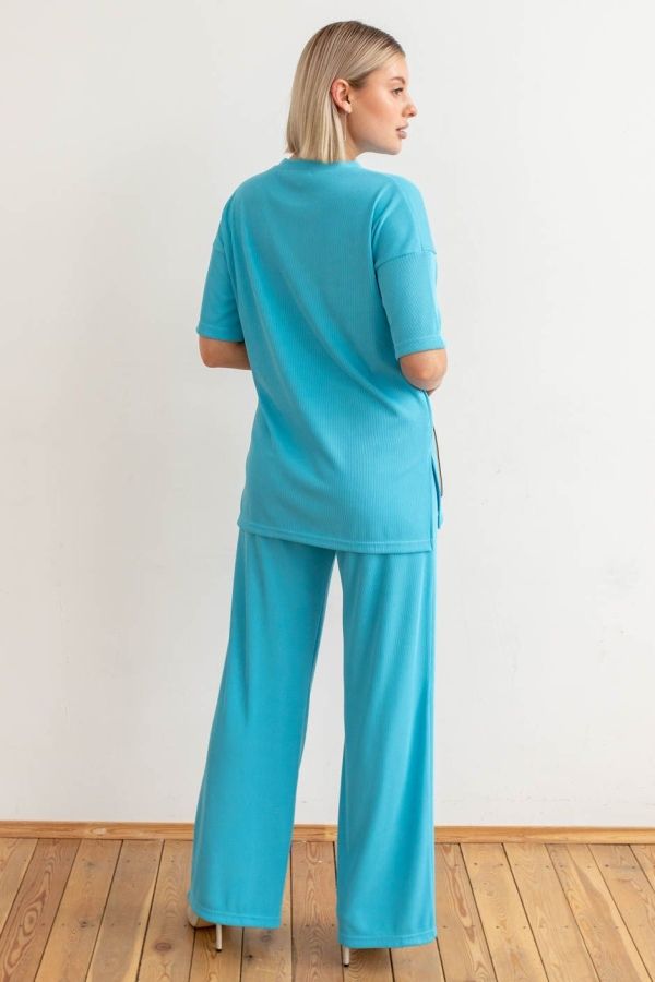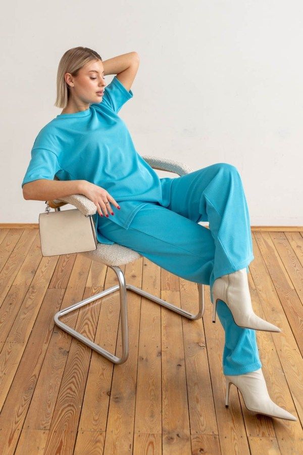 Ткань: трикотажное полотно с выработкой в мелкую резинку.Блузка - футболка свободного простого покроя,в боковых швах разрезы, рукав короткий.Длина изделия ок. 70см. Брюки "палаццо" с высокой посадкой. Пояс на резине. Длина по внутреннему шву ок. 84см.