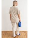 Ткань: трикотажное полотно с выработкой в мелкую резинку.Блузка - футболка свободного простого покроя,в боковых швах разрезы, рукав короткий.Длина изделия ок. 70см. Брюки "палаццо" с высокой посадкой. Пояс на резине. Длина по внутреннему шву ок. 84см.