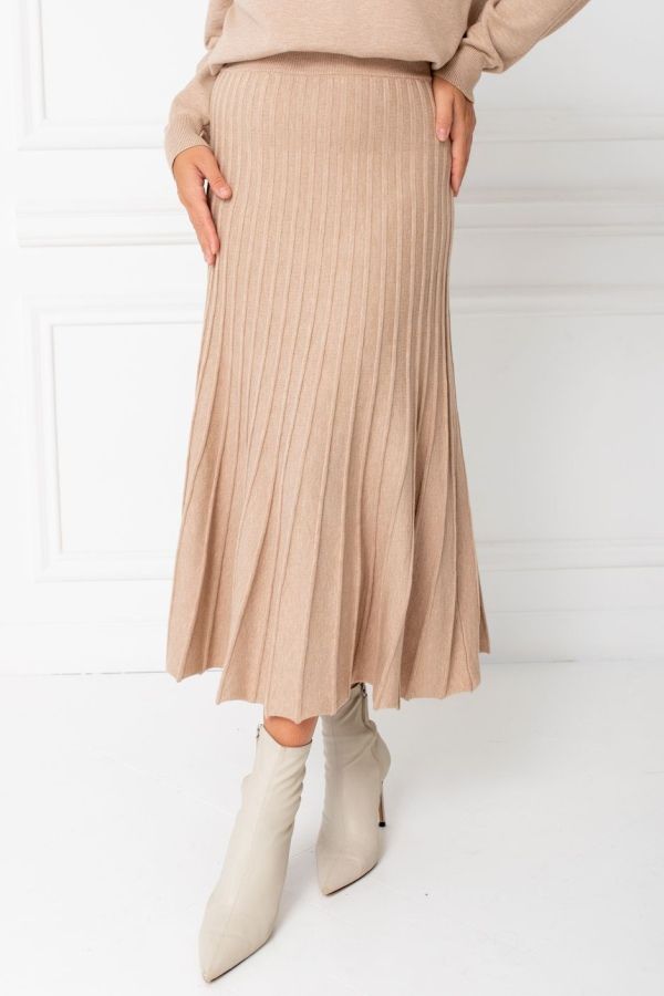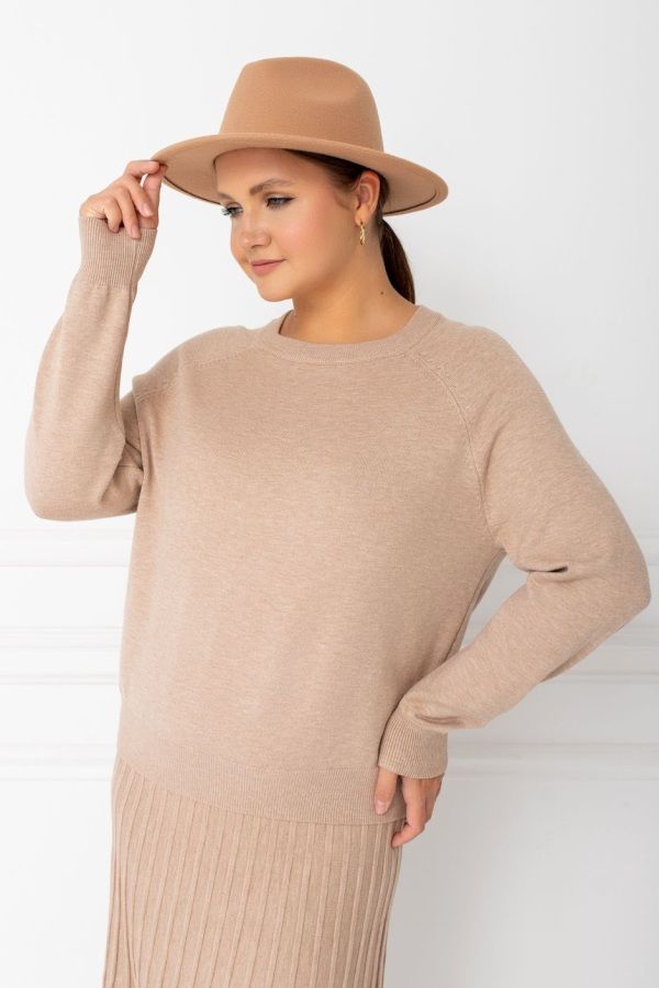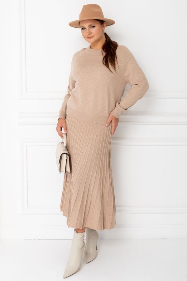 Ткань: трикотажное полотно. Джемпер простого покроя, рукав реглан длинный, длина ок. 60 см. Юбка расклешённая за счет вязки, пояс на резине длина ок. 87 см.