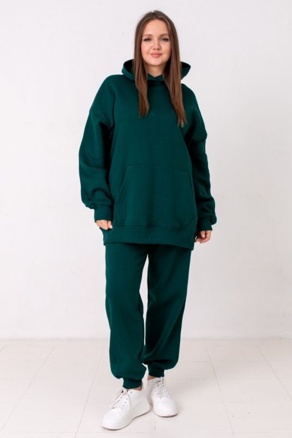 Ткань: футер с начесом. Худи свободного покроя, с капюшоном, спереди карман-кенгуру. Линия плеча занижена, рукав длинный. Длина ок 71см. Брюки со средней посадкой до талии, пояс на резине, со шнуром. Длина по внутреннему шву ок.73см
