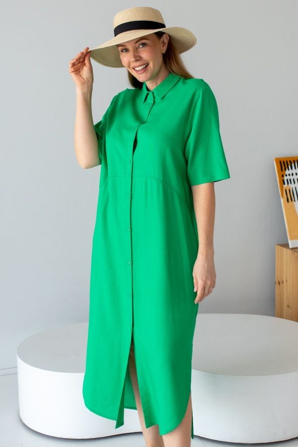 Ткань: лен искусственный, однотонный. Платье-рубашка свободного, прямого покроя, воротник на стойке, застежка на пуговицы до низа. Под грудью декоративный подрез, в боковых швах прорезные карманы. Низ изделия спереди в разрезах, закругленный. По спинке кокетка со складкой от кокетки.