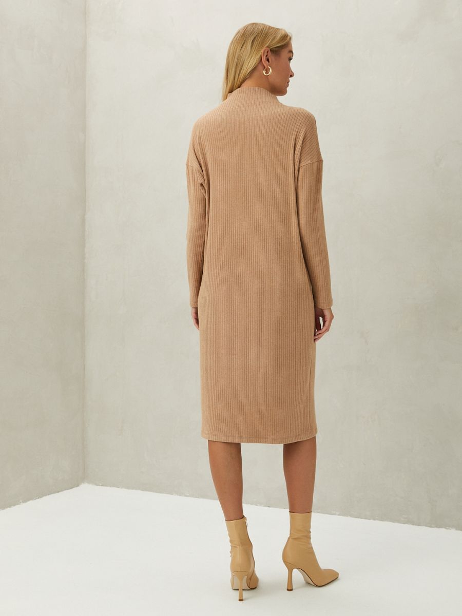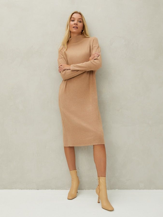 Миди-платье светлого коричневого оттенка, будет органично смотреться и в офисе, и на прогулке в городе. Для пошива модели с цельнокроеным воротником-стойкой и спущенной линией плеч, использовали мягкий уютный трикотаж в широкий рубчик. Лаконичное платье станет удачным фоном для аксессуаров."