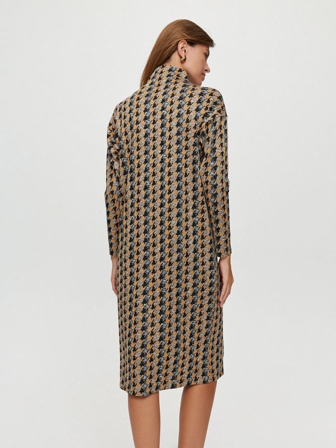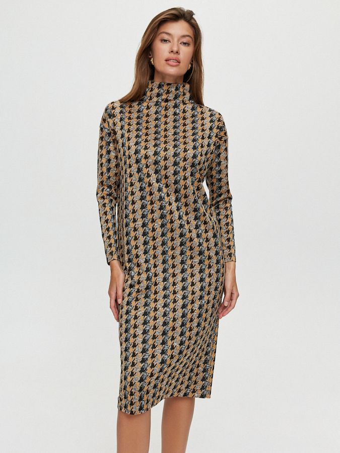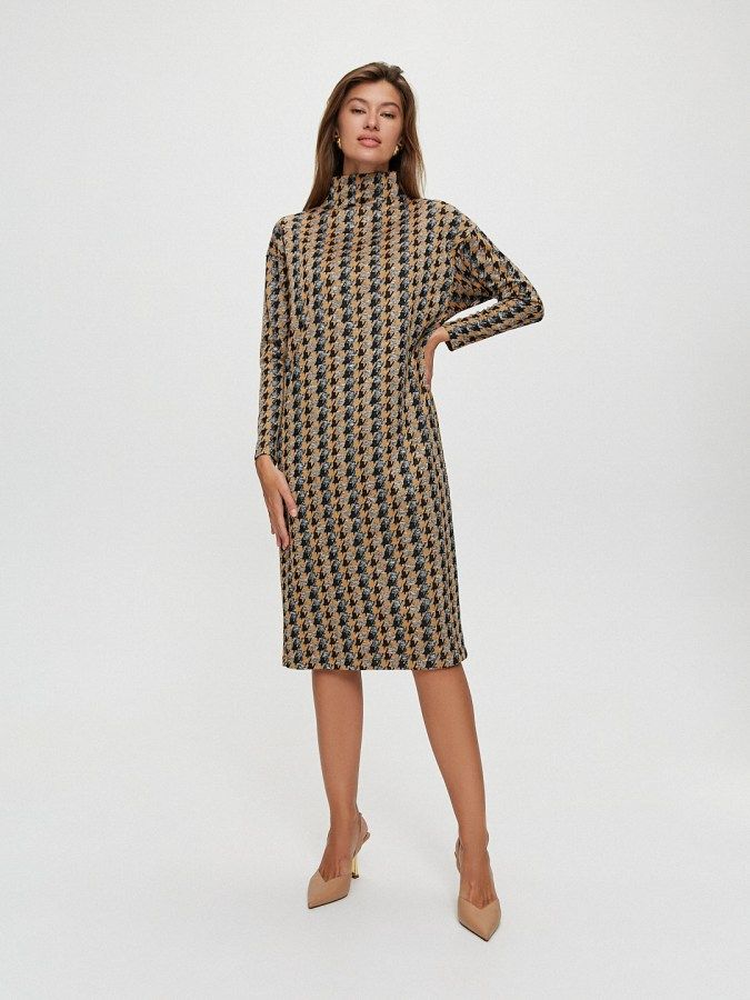 Трикотажное платье прямого силуэта получилось максимально лаконичным. Цельнокроеный воротник плотно облегает шею, но благодаря эластичному переплетению нитей, не нарушает комфорта. Спущенная линия плеч, низкая пройма и зауженные длинные рукава обеспечивают безупречную посадку на фигуре, сохраняя тепло и не перегревая. Минимализм модели компенсировали жаккардовым рисунком. Плотный эластичный трикотаж с добавлением мягкой вискозы деликатно мерцает благодаря сочетанию горчичных, черных и серебристых нитей. Длина миди позволяет регулировать силуэт кожаным поясом (в комплект не входит).
