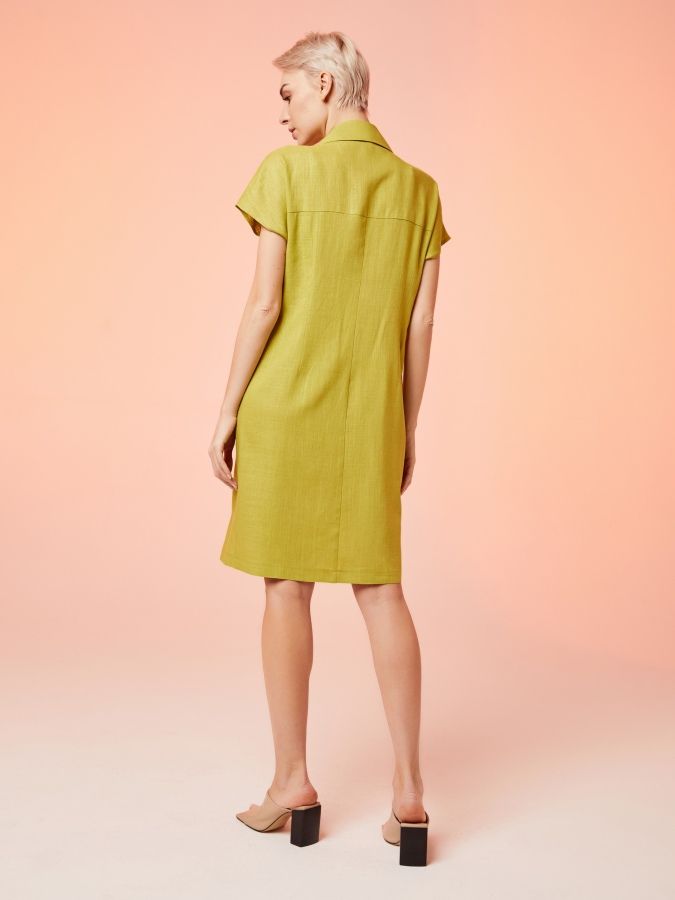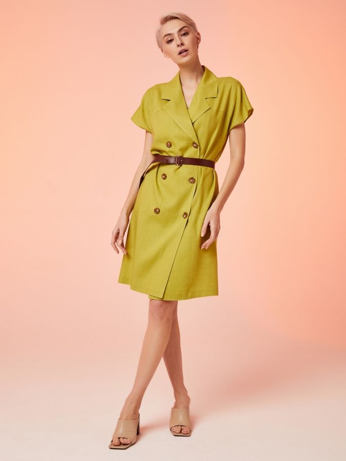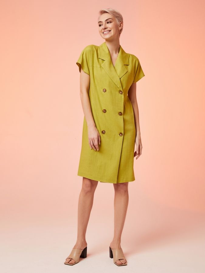 Силуэт этого платья позаимствован у двубортного жакета и задаёт деловое настроение даже жарким летним днём. Излишнюю строгость смягчает мягкая линия короткого цельнокроеного рукава, широкие лацканы и насыщенный оттенок цветков липы. Для пошива модели длины до середины колена выбрали тонкую ткань, имитирующую лён. Ряд акцентных пуговиц усиливает элегантный характер этого платья. Используйте коричневый ремень, если хотите подчеркнуть талию.