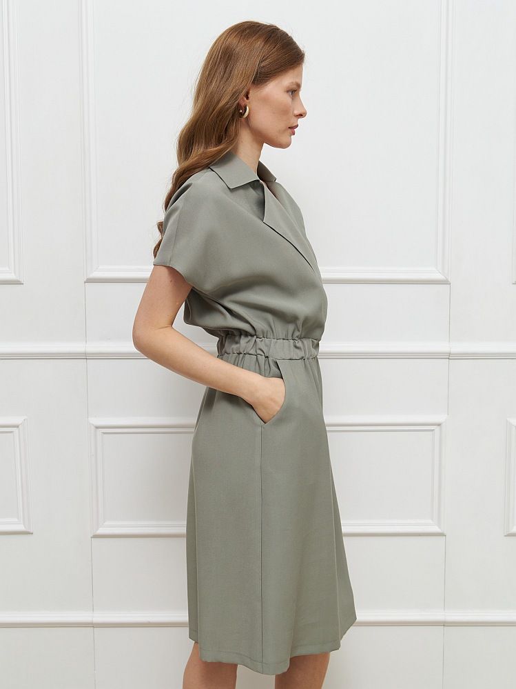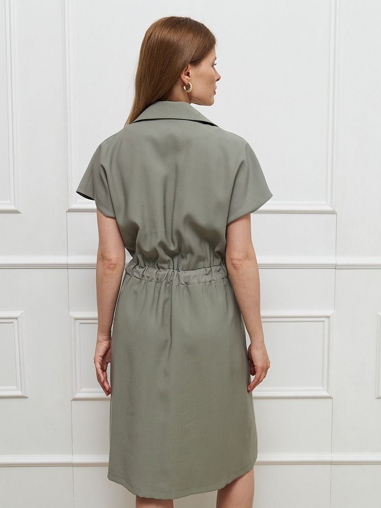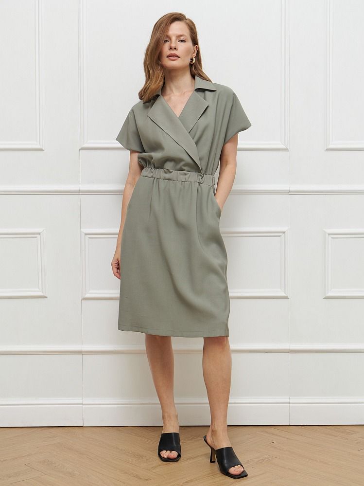 Верхняя часть платья оттенка хаки сделали похожим на пиджак с широкими лацканами. Для пошива модели на запах, с боковыми карманами и эластичным поясом, использовали дышащий материал на основе модала, обеспечивающий комфорт в теплую погоду. Прямой крой, длина до середины колена.
