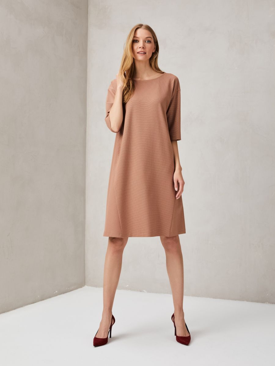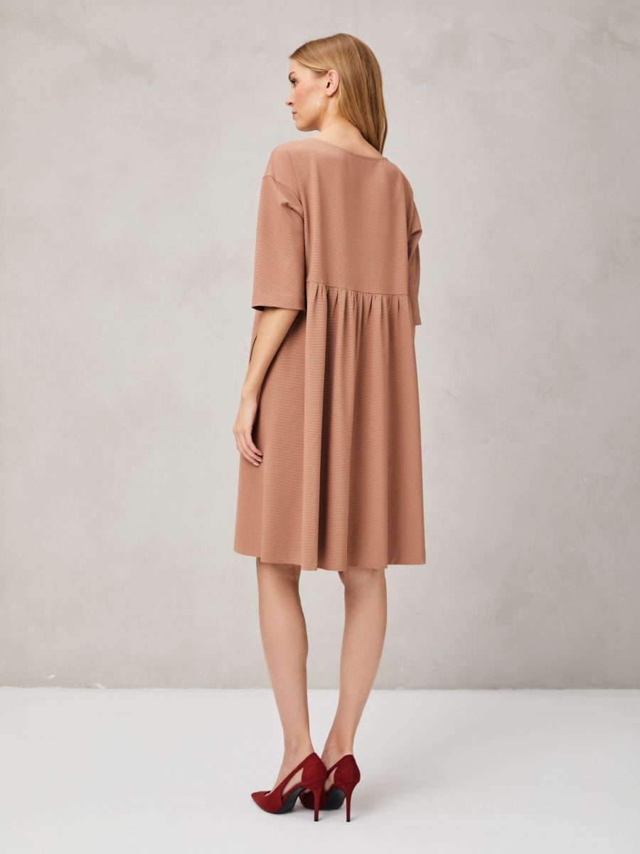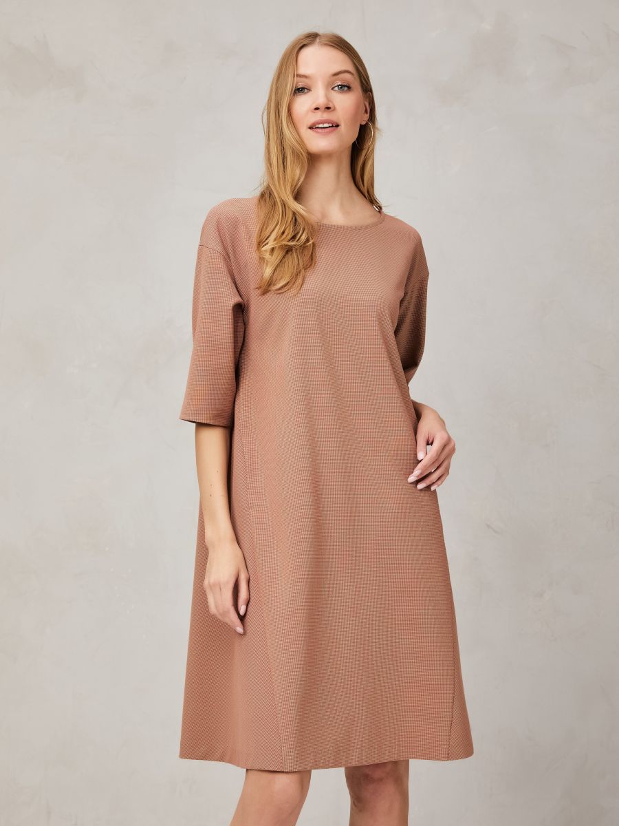 Платье свободного кроя, приглушенного кораллового оттенка, создает правильное осеннее настроение. Принт в микролапку «Пье-де-пуль», делает ткань фактурнее, а модель интереснее. Комфортная горловина, рукава 3/4, карманы в рельефных швах. Подрез и сборка на юбке сзади, акцентируют внимание на талии. Для изготовления этой модели использовали тонкую смесовую ткань, которая хорошо драпируется и приятная к телу.