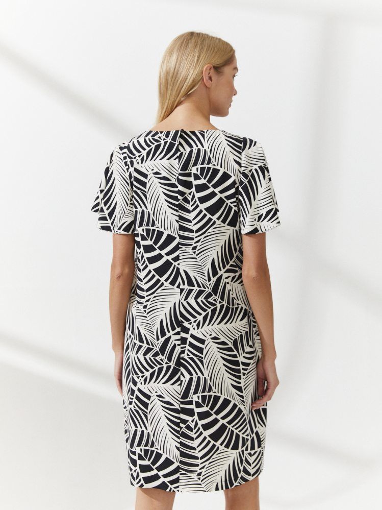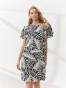 Черно-белое прямое платьем крупным принтом длиной до середины колена получилось романтичным благодаря расклешенным рукавам-воланам. Круглая горловина застегивается пуговицей на спинке. Для пошива модели использовали плотный вискозный материал, который сохраняет безупречный внешний вид в течение всего дня.