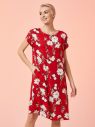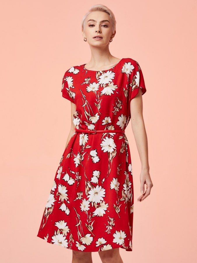 Для создания платья с крупными цветами выбрали шелковистый материал из 100 % вискозы, который драпируется крупными складками и хорошо держит форму. Насыщенный красный оттенок усиливает жизнерадостное настроение. Свободный А-силуэт отлично впишется в летний гардероб. Боковые карманы и лаконичный вырез горловины. Если хотите сделать акцент на талии, используйте кожаный ремешок.
