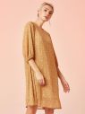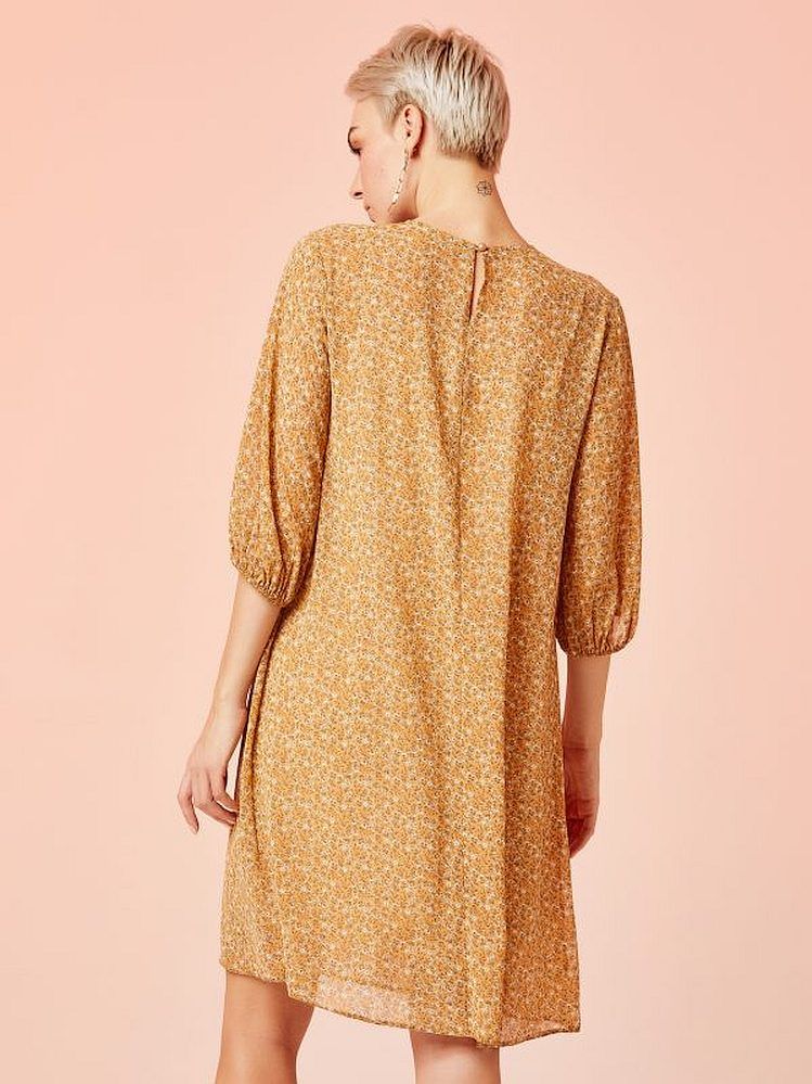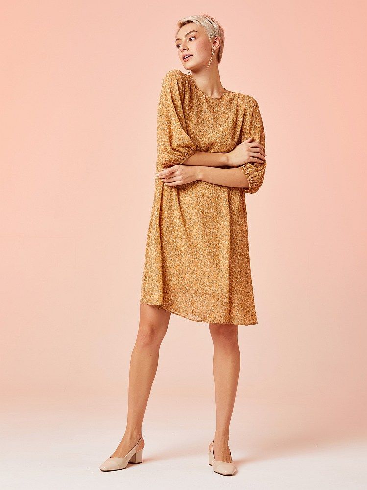 Платье песочного оттенка А- образного силуэта, длиной до колена, окутано романтичностью. На это работает принт La Reverie (от франц. мечтательность), напечатанный на полупрозрачном шифоне. Заданное рисунком настроение поддержали рукавами-фонариками и летящим силуэтом. Застежка на пуговицу сзади. Нижний чехол на тонких бретелях выполнен из вискозного штапеля.