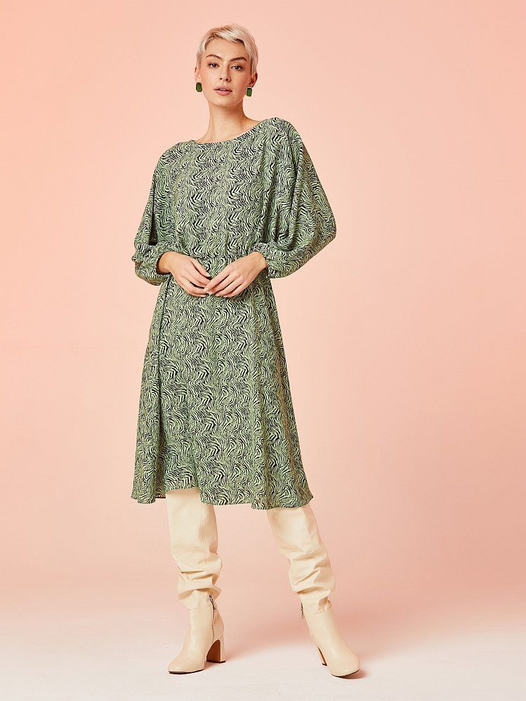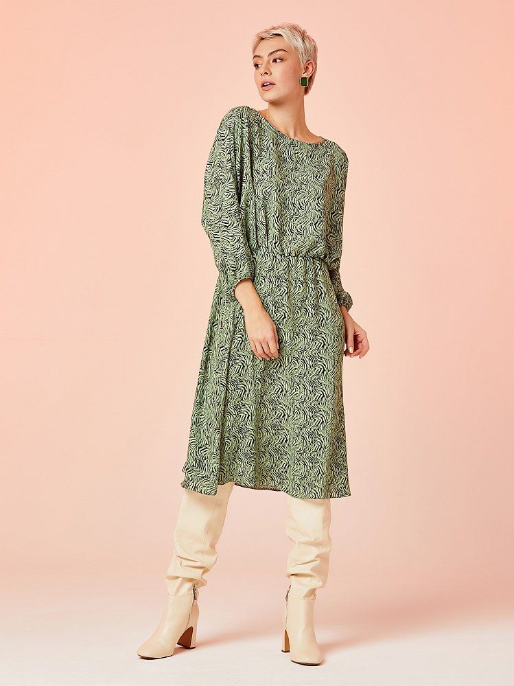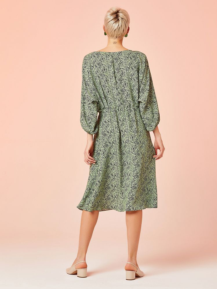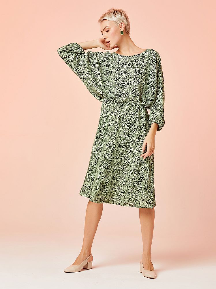 В этой модели анималистичный мотив уравновешен спокойным зелёным оттенком и мягким силуэтом. Платье с цельнокроеными широкими рукавами и пышным лифом, приталивается мягкой резинкой. Модель выполнена из тонкого невесомого материала, поэтому расклешенная юбка-миди хорошо драпируется книзу мягкими складками. Вырез лодочкой, рукава по низу поисобраны на тонкую резинку.