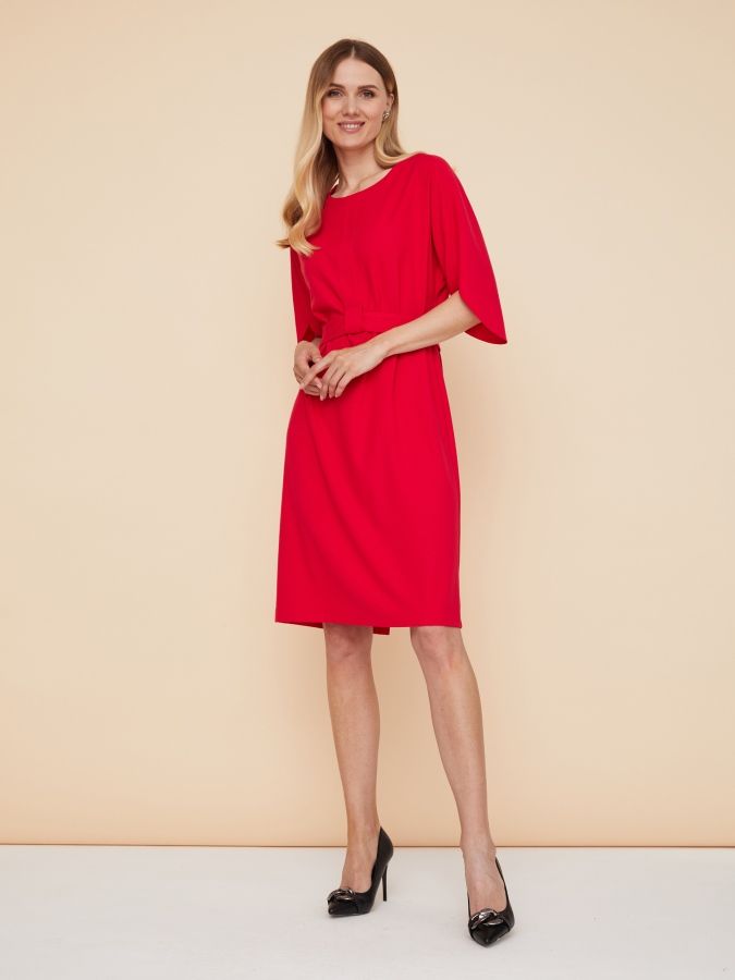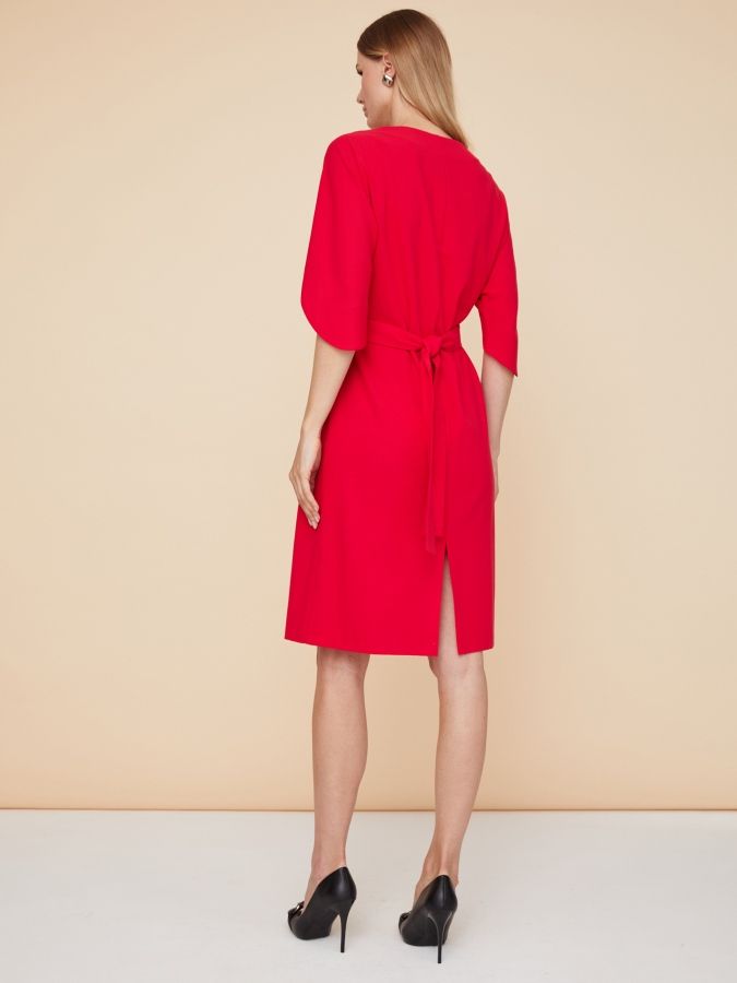 Несмотря на лаконичный крой, это платье непременно окажется в центре внимания. Взгляды привлечет карминово-красный оттенок, цельнокроеные широкие рукава с фигурной линией низа и вертикальная планка, вытягивающая силуэт. Свободное платье приталивается по фигуре длинным поясом, который продергивается в петлю спереди и завязывается на спинке. Отличная модель для праздника и торжественного мероприятия.