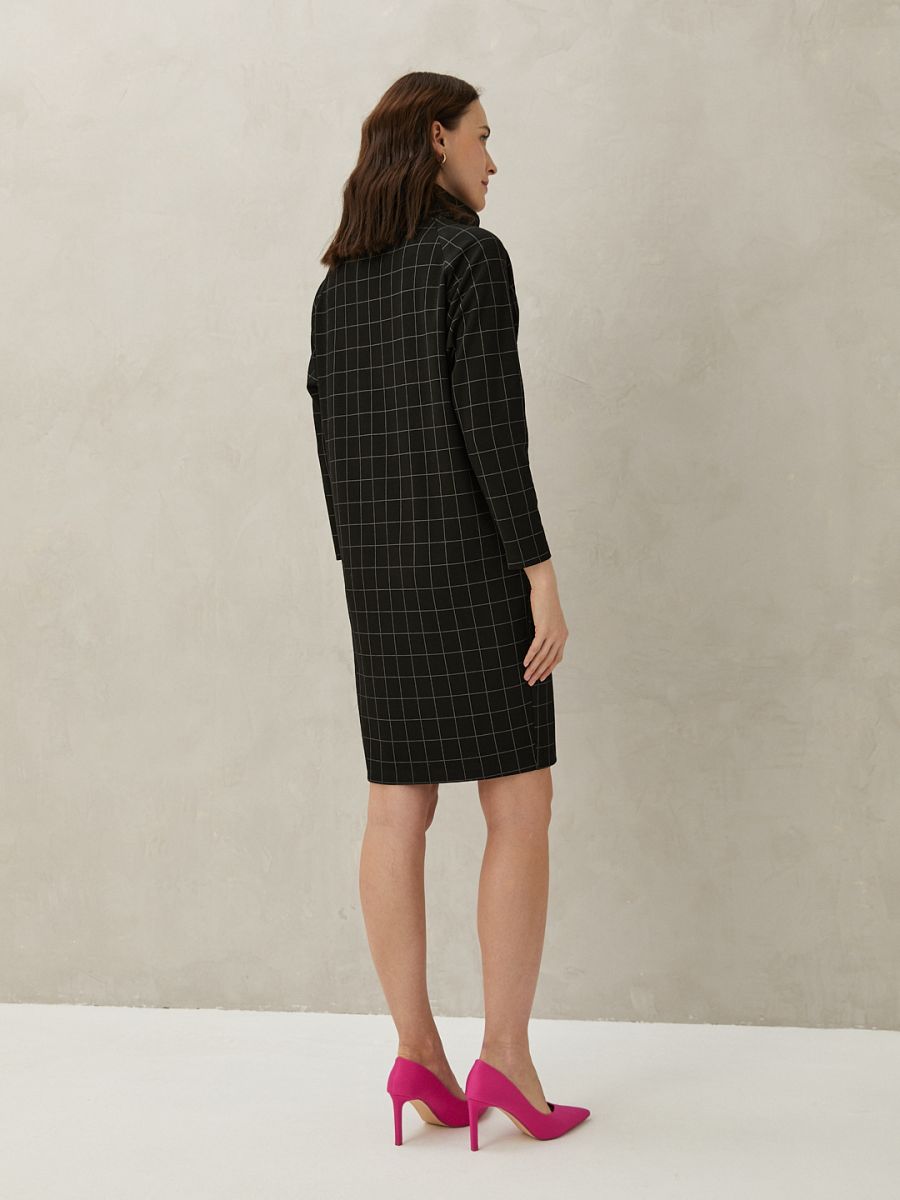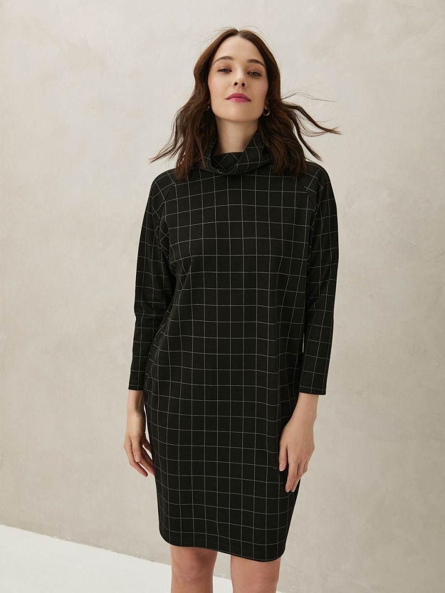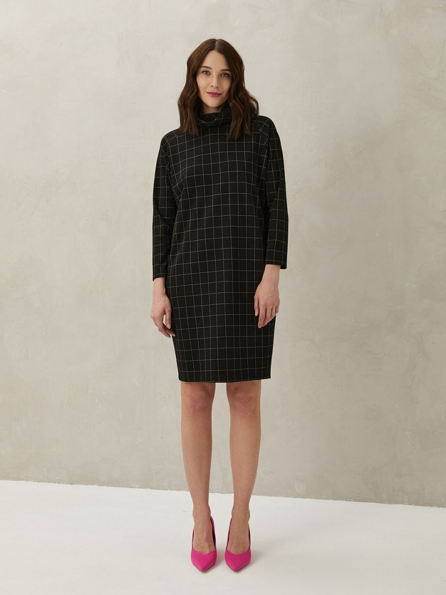 Чёрное платье с длинными рукавами реглан, воротником-хомут и карманами в боковым швах сшито из мягкого трикотажа с клетчатым принтом. За комфортную посадку отвечает не только материал, но и свободный силуэт с низкой проймой и зауженной линией низа."