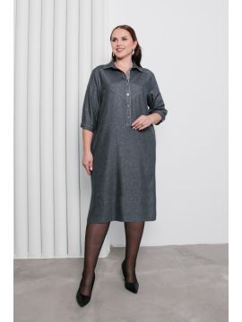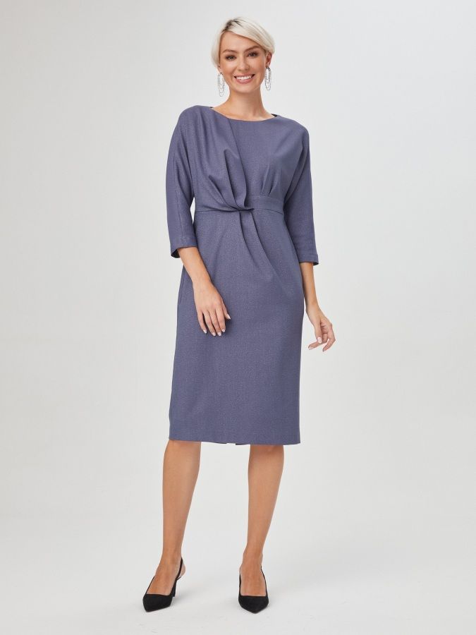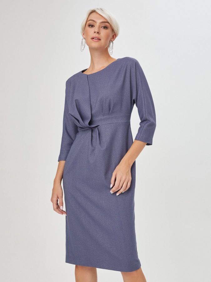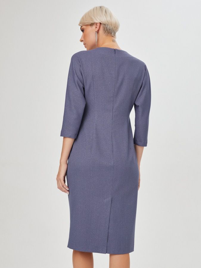 Для пошива серебристого приталенного платья с цельнокроеными рукавами 3/4 использовали плотную ткань с эластаном. Материал с металлизированными нитями создает мягкое мерцание. Асимметричная драпировка лифа заканчивается складками у пояса, талия поддёрнута широкой вставкой, зауженная юбка длиной чуть ниже колена имеет мягкие косые защипы. Застежка на молнию на спинке и шлица. Платье прилегающего силуэта для праздничных выходов.