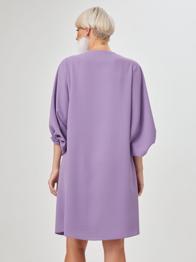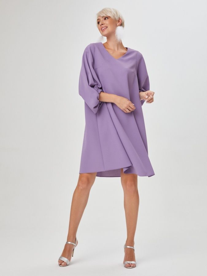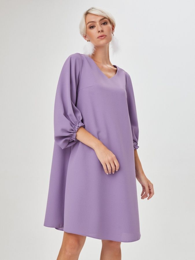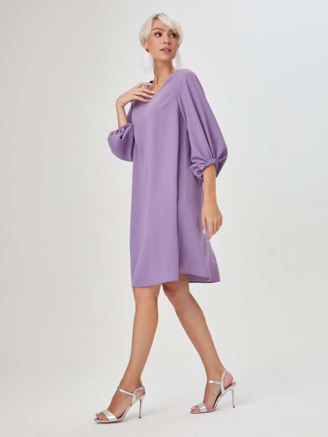 Сочный сиреневый оттенок автоматически выводит это платье в центр внимания. V-образный вырез приоткрывает декольте, широкий подол струится мягкими складками в движении, объемные рукава добавляют романтичности. Нежное воздушное платье для праздничных выходов выполнено из тонкого крепа с матовой поверхностью.
