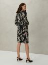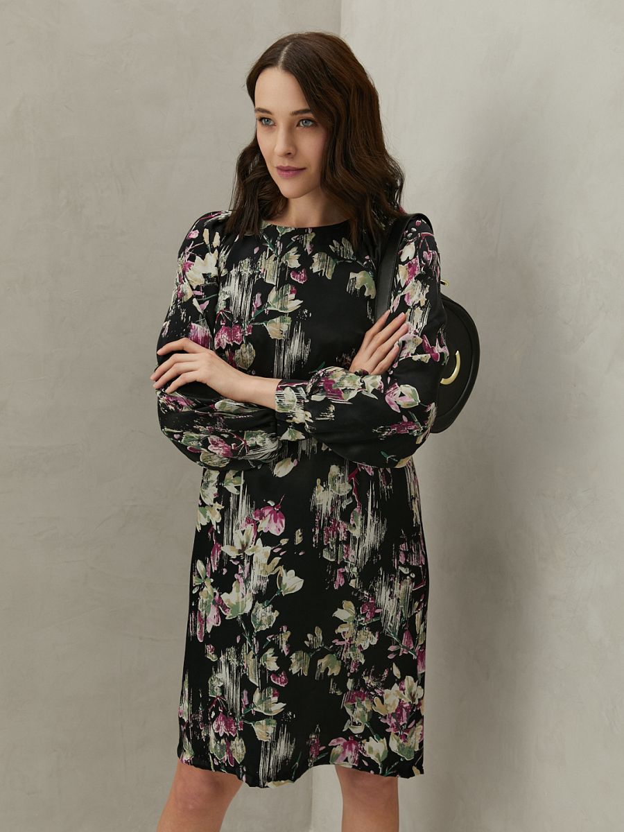 Для пошива прямого платья с круглой горловиной, выбрали вискозный атлас с рисунком, напоминающим гравюру. Мягкие складки создают дополнительный объем длинным рукавам реглан, широкие манжеты на пуговицах делают модель удобной для повседневной носки. Длина до середины колена, застёжка на пуговицу сзади."