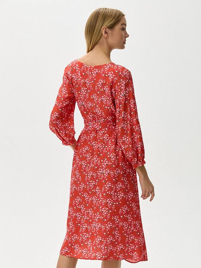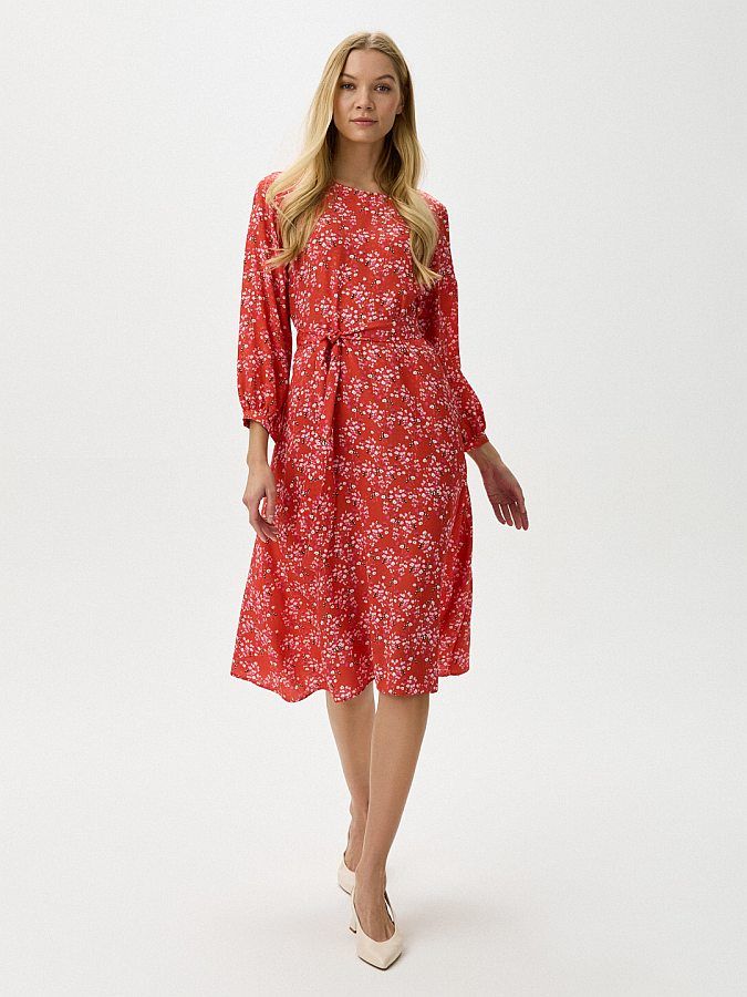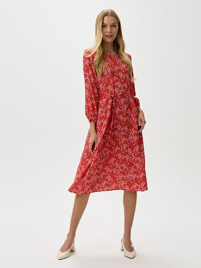 Платье-миди с расклешенной юбкой выполнили из тонкого жаккарда из вискозы насыщенного красного оттенка с мелким цветочным рисунком. Материал особенно хорошо пропускает воздух и слегка охлаждает кожу. Овальная горловина, длинные присобранные рукава на манжетах. В комплекте – пояс-лента, акцентирующий внимание на талии.