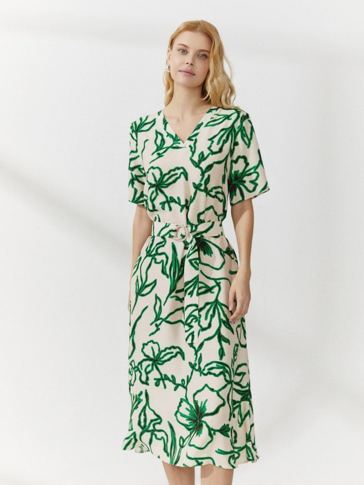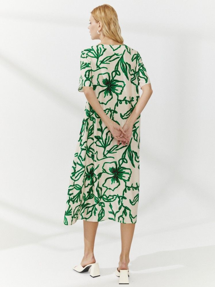 Длинное платье с V-образной горловиной и короткими рукавами выполнено из шелковистой вискозной ткани с растительным принтом на молочном фоне. Приятный к телу текстиль мягко скользит по телу и ниспадает крупными плавными волнами на подоле. Акцент на талии позволяет создать пояс с пряжкой в тон изделию.