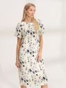 Нежный цветочный орнамент на молочном фоне подчеркивает отточенный А-силуэт этого миди-платья. Модель свободно сидит на фигуре, без излишнего прилегания, короткие рукава заканчиваются манжетами и не облегают руку. Легкое платье для романтичных натур.