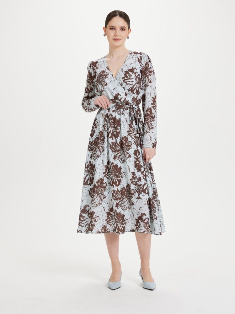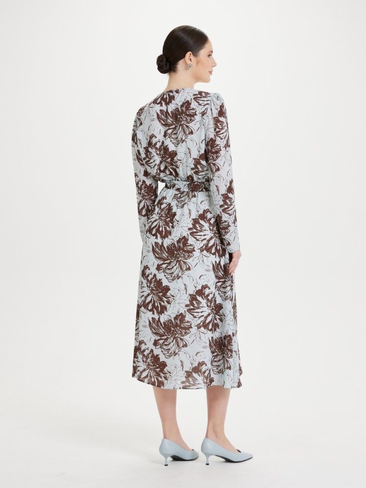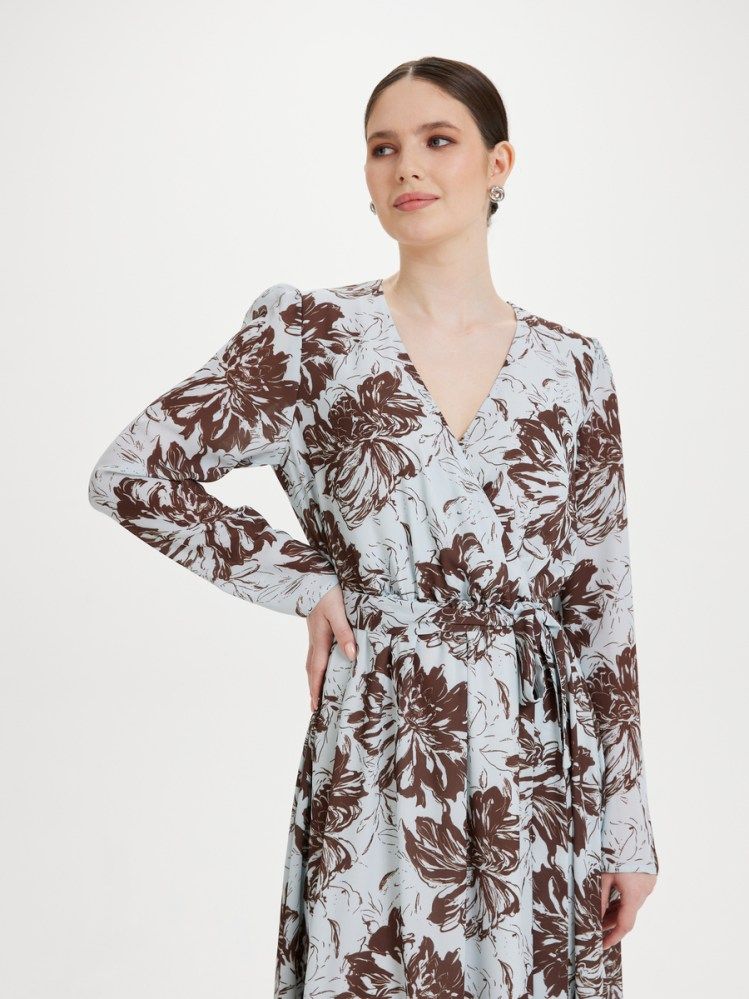 Женственное платье из нежного крепа с цветочным принтом в оттенках нежно-голубого и горькго шоколада. Приталенный силуэт с комфортной посадкой на резинку по талии делает платье комплиментарным любой фигуре и росту. Имитация запаха, летящая юбка длины миди, руква с легкой присборкой по плечу и завершающий образ пояс. Платье на нежном шифоновом подкладе, без застежки.