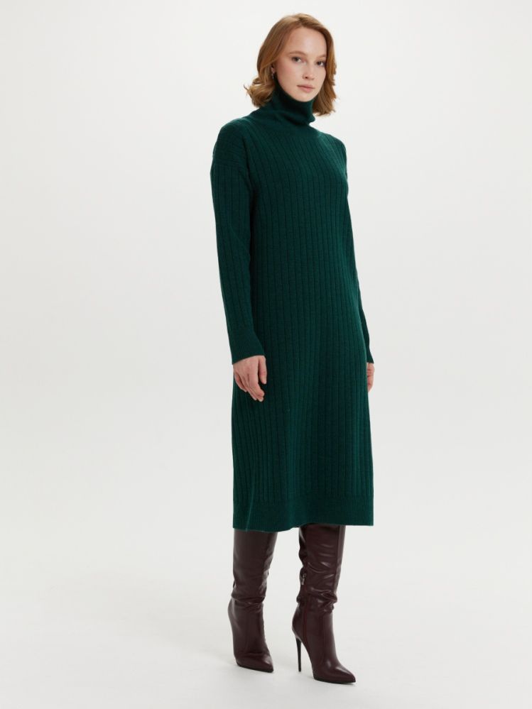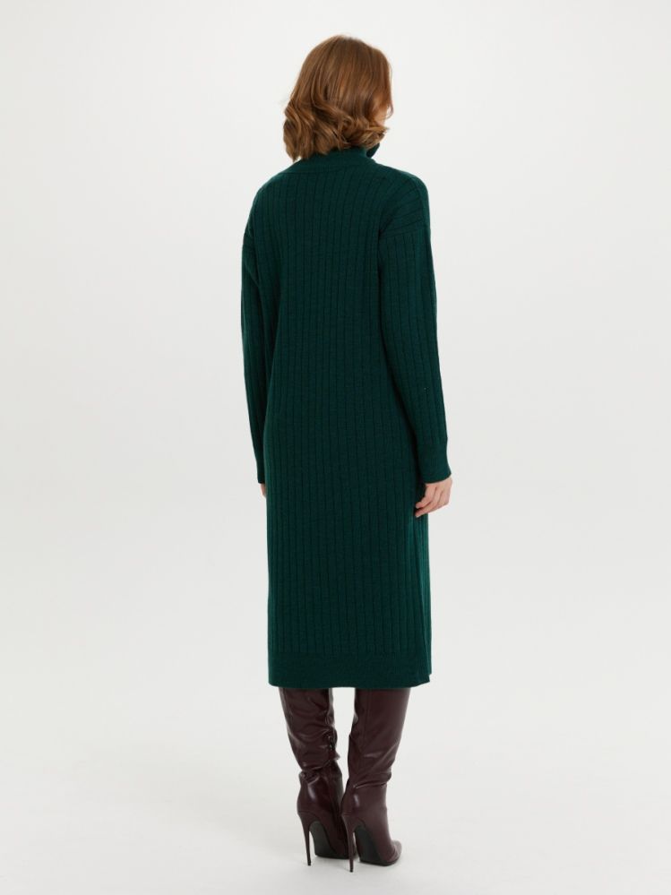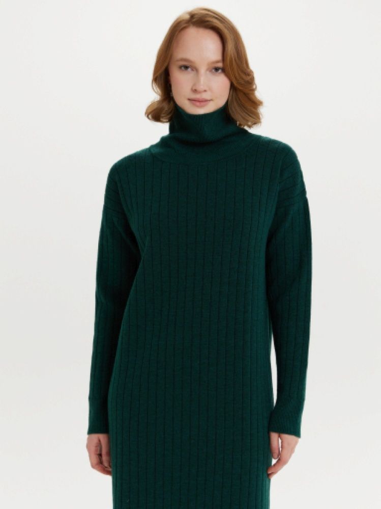 Платье свободного силуэта с горловиной стойкой. Плечо спущенное, рукав длинный. Переплетение платья - разбор на ластике, что визуально вытягивает силуэт. Благодаря специальному переплетению, платье не будет сильно деформироваться. Теплое, уютное платье за счет шерсти в составе пряжи.