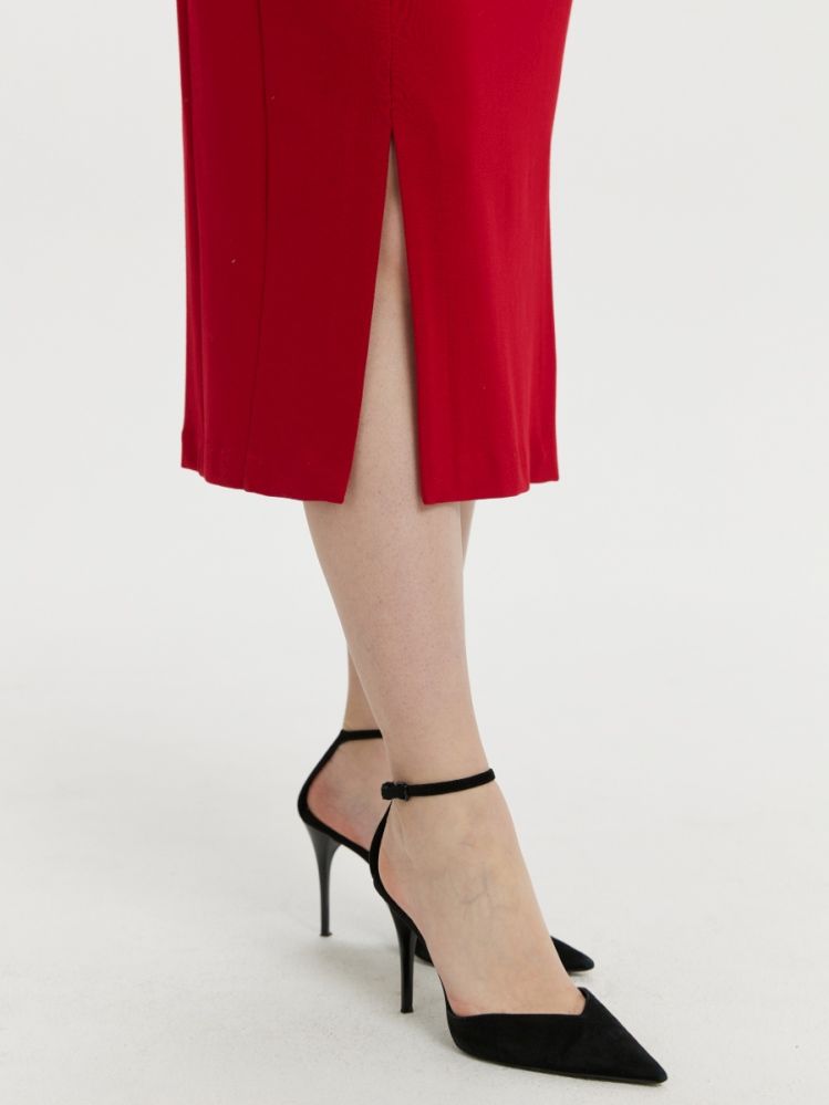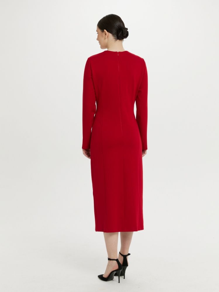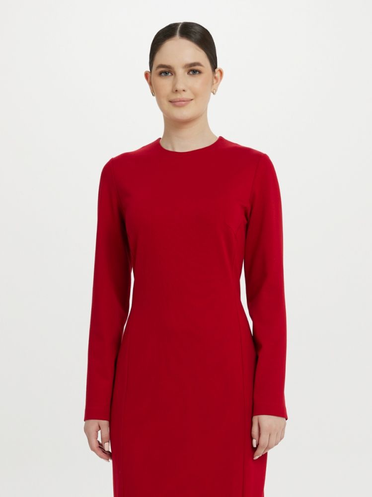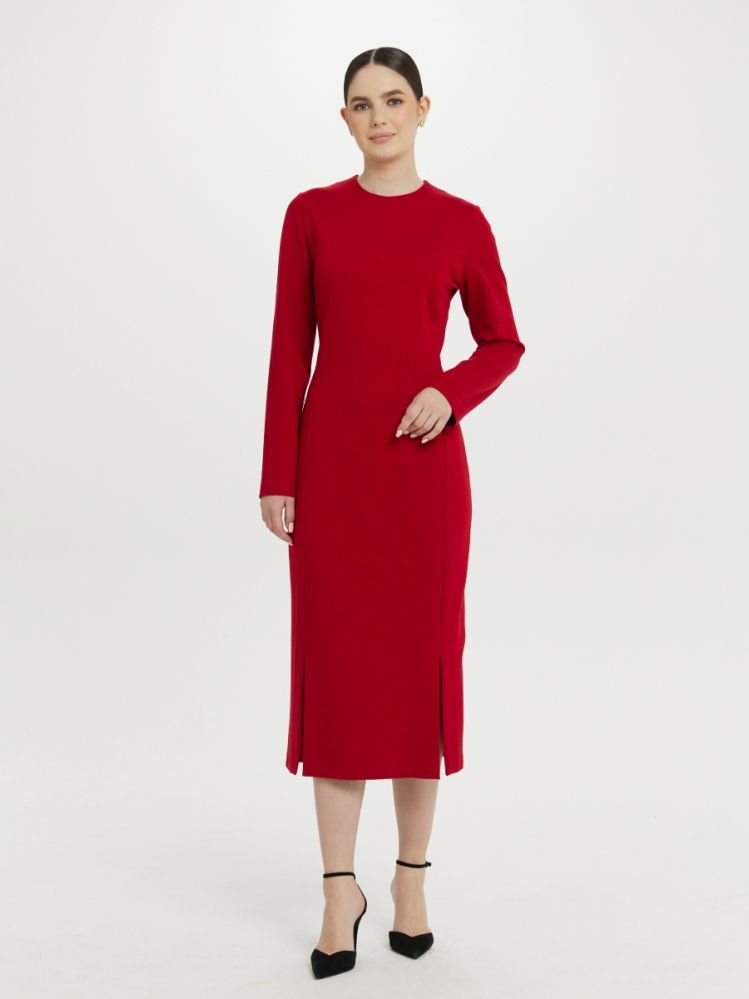Платье - футляр в длине миди с рельефными швами по полочке и спинке, формирующими силуэт, и эффектными разрезами. Платье выполнено из выразительного красного плотного трикотажа, неотрезная талия и нагрудные вытачки обеспечивают идеальную посадку. Прямой зауженный рукав полной длины и застежка на потайную молнию по спинке.