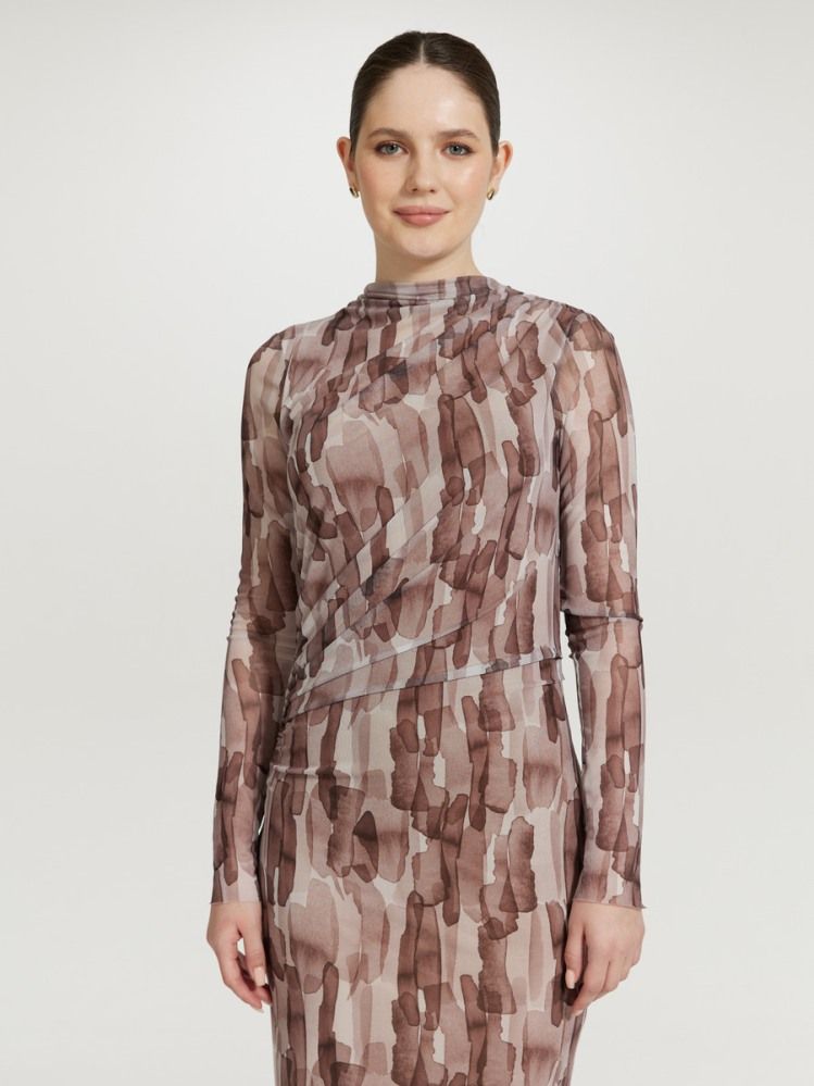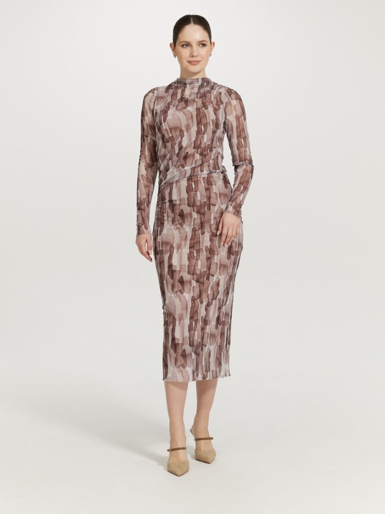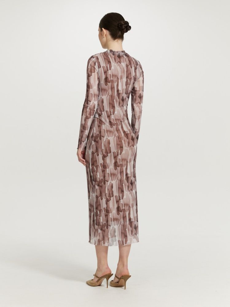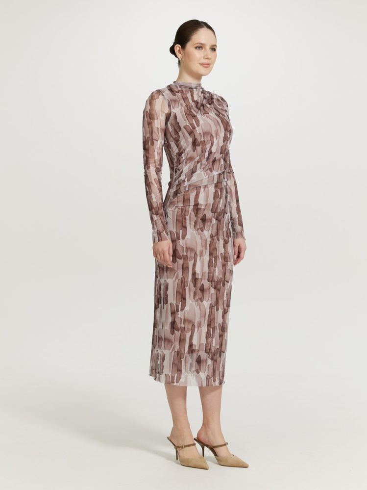 Трендовая модель платья из сетки с асимметричными сборками по талии и плечу. Длинный рукав, прямой силуэт, длина миди, без застежки, подклад из нежной натуральной эластичной вискозы. Принт акварель в оттенках горького шоколада, бежевой пудры и молочного.