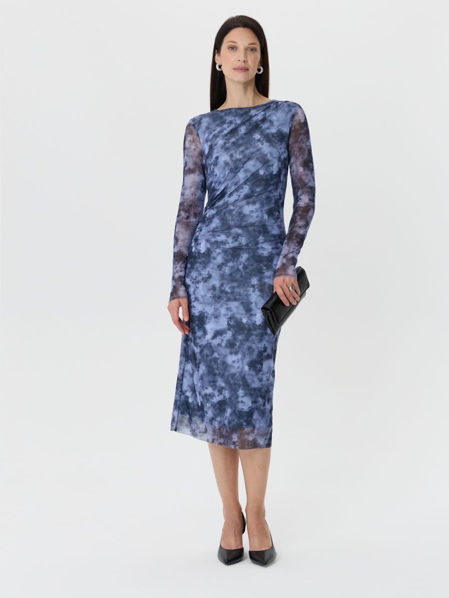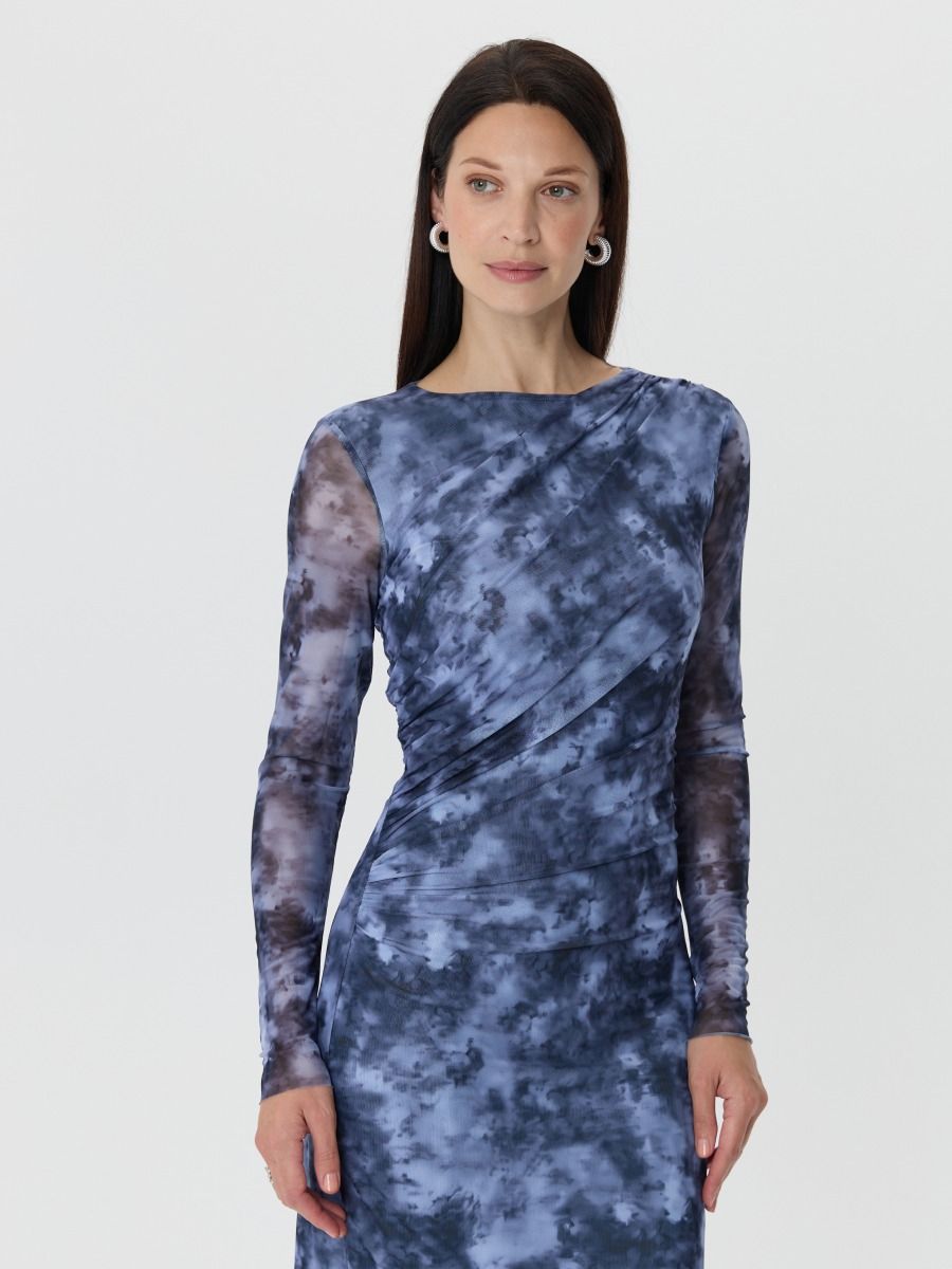 Откройте для себя изящество и утонченность с нашим платьем из трикотажной сетки, принт с сапфировыми переливами придает платью роскошный облик и уникальность. Прилегающий силуэт и длина миди подчеркивают вашу фигуру, создавая элегантный образ. Асимметричные складки добавляют динамики и современного стиля, а длинные рукава завершают гармоничный ансамбль. Вискозный подклад обеспечивает комфорт и приятные ощущения на коже. Это платье идеально подойдет для особых случаев и подчеркнет вашу индивидуальность.