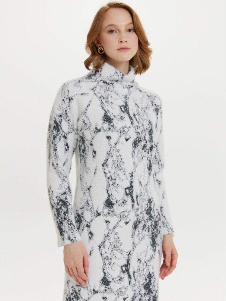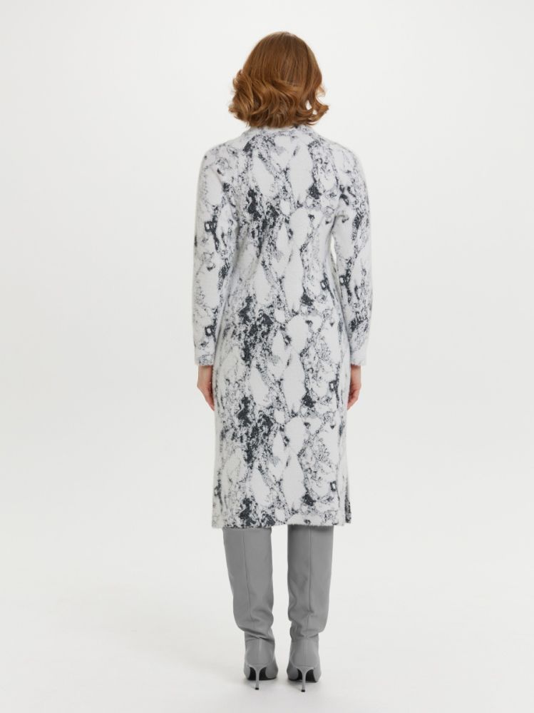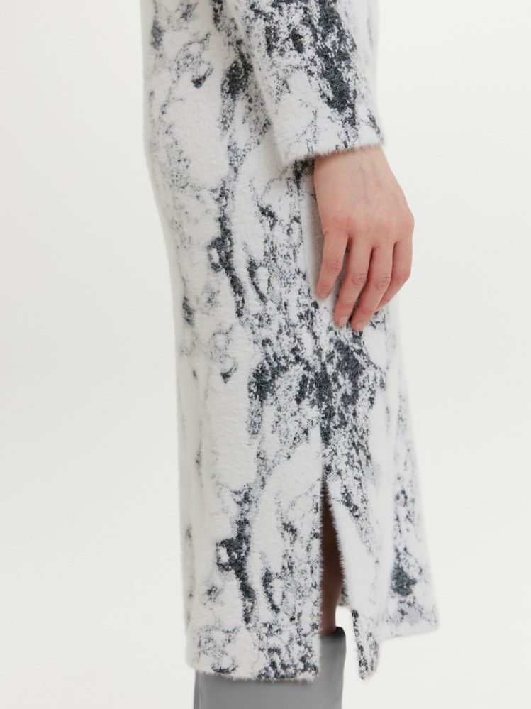 Мягкое нежное трикотажное платье прямого силуэта с рукавом реглан и воротником стойкой, а также элегантными разрезами по бокам. Пушистая фактура трикотажа приятна к телу, дарит ощущение тепла и мягкости, согревая в холодную осеннюю погоду. Жаккардовое переплетение белой нити и разных оттенков серого имитируют роскошный мраморный рисунок.