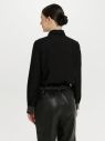 Стильная и оригинальная рубашка прямого силуэта с классическим рубашечным воротником и манжетами, декорированными металлическими цепочками бусин. Застежка на пуговицы. Жаккардовое переплетение ткани создает необычную фактуру, таким образом рубашка сочетает в себе женственность и брутальность, классику и креатив. Модель сочетается со всеми черными поясными изделиями капсулы.
