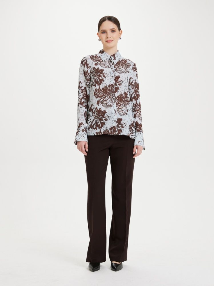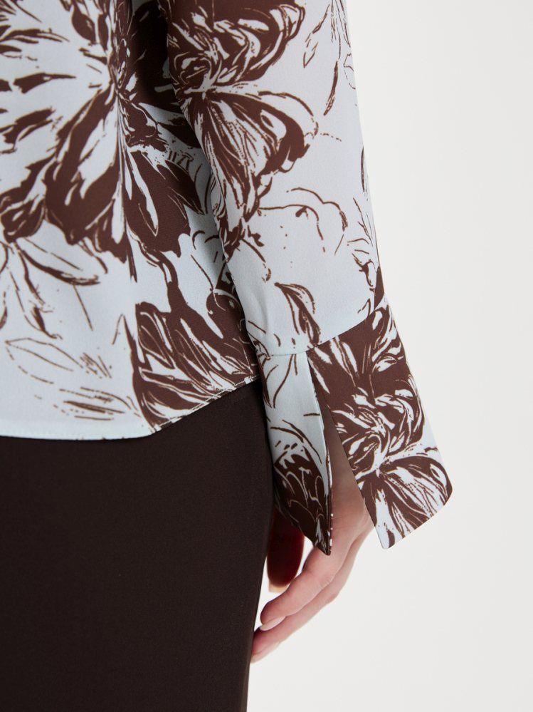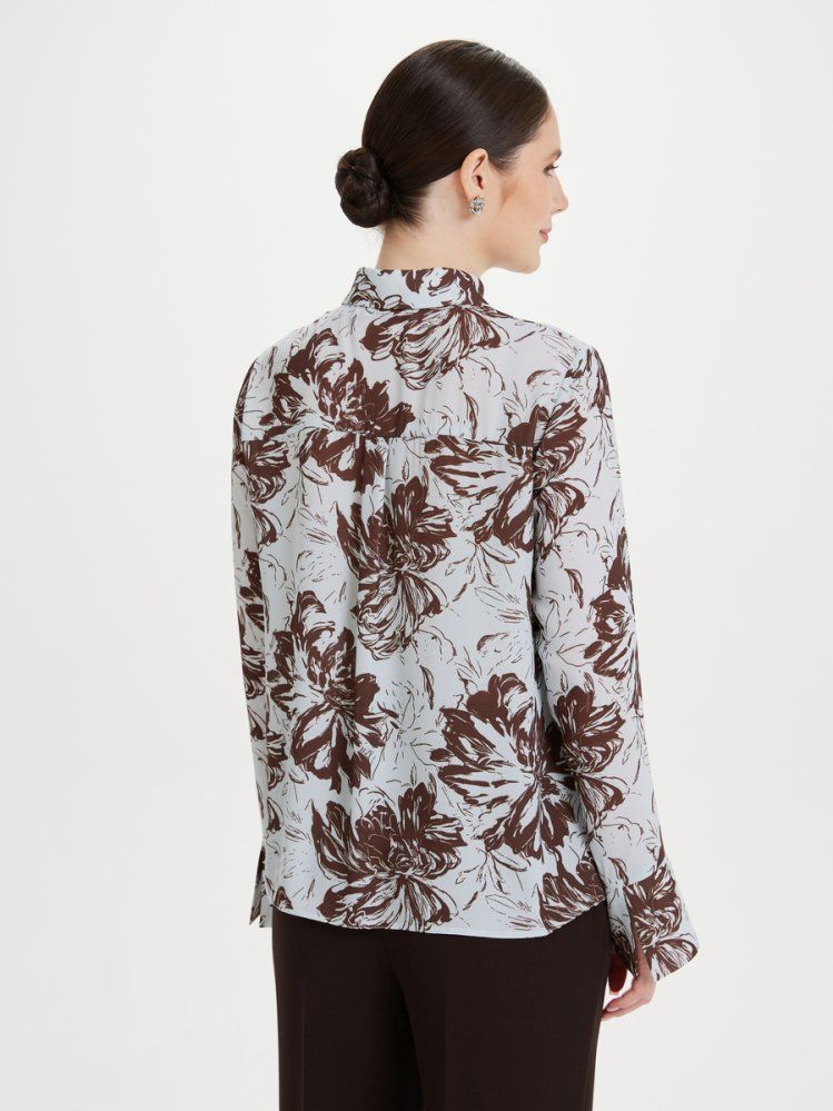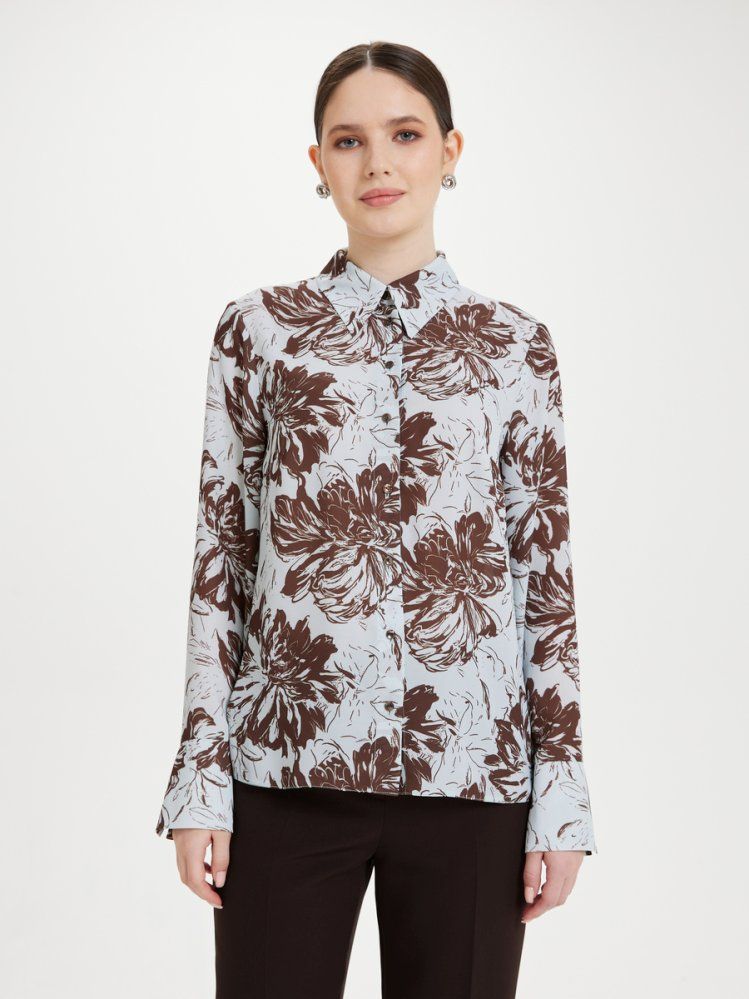 Рубашка из нежного легкого крепа с цветочным принтом в сочетании нежно-голубого и оттенка горького шоколада. Высокие манжеты без застежки с разрезом. Кокетка и бантовая складка по спинке. Классический рубашечный воротник и застежка на пуговицы. Отлично подойдет к любым брюкам из коллекции.