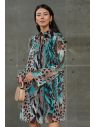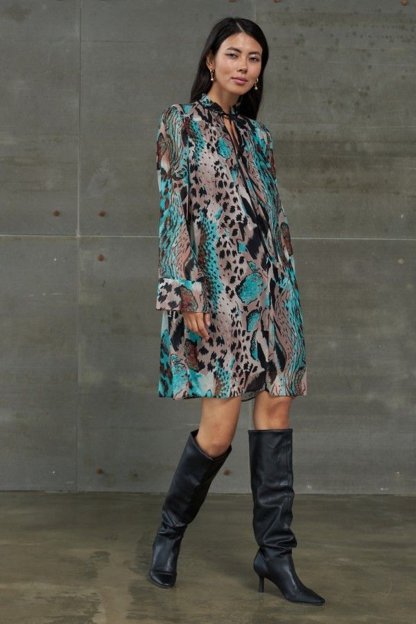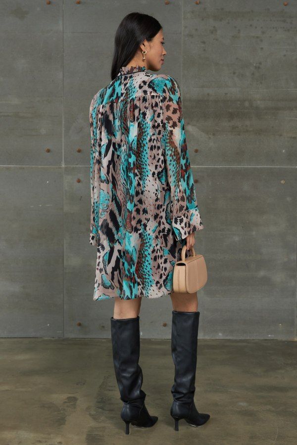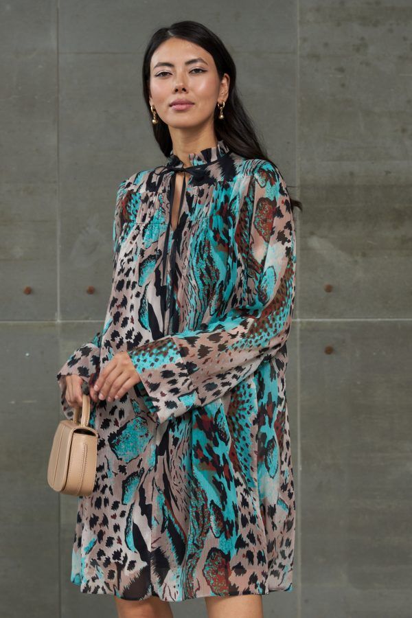 Легкое струящееся платье из шифонового полотна, на подкладке из стрейч шифона. Анималистичный стильный принт. Модель свободного силуэта, с декоративной сборкой по по переду, и кокеткой на сборке по спинке. Горловина с завязками и рюшей. Рукав прямой расширенный с отрезной манжетой.