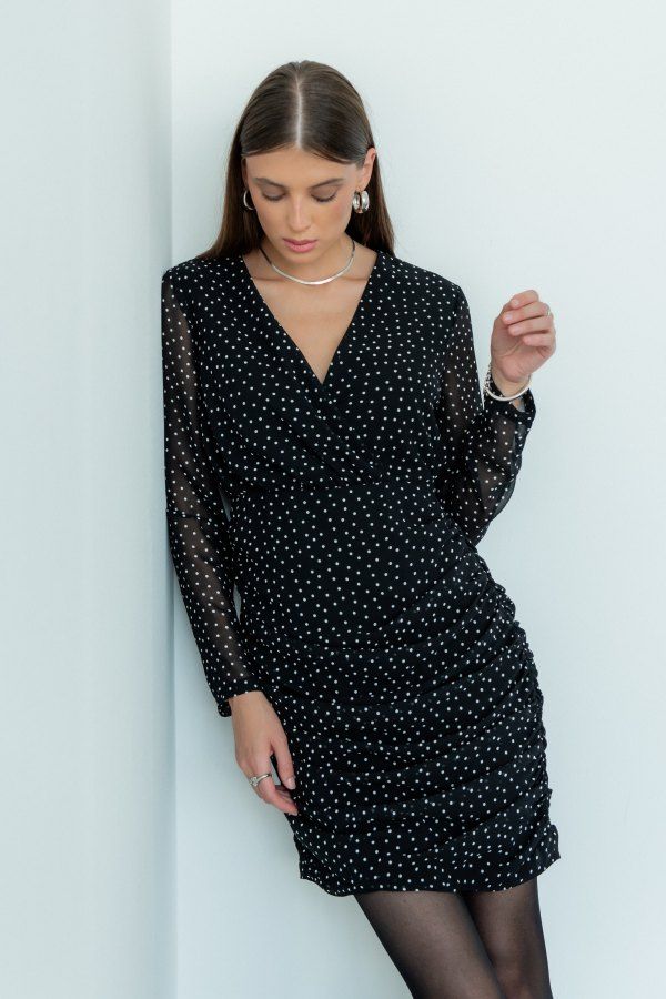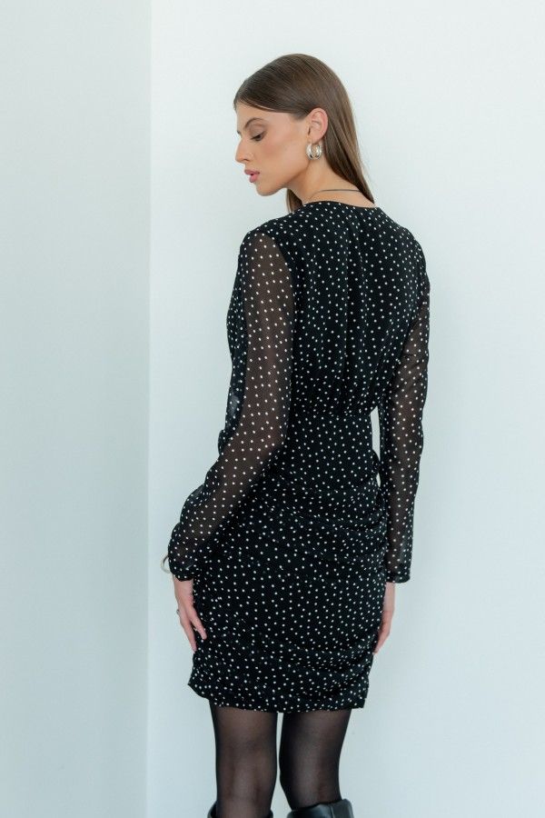 Стильное женственное платье из шифонового полотна на подкладке из стрейч шифона. Модель прилегающая, с втачным прямым рукавом. Декоративный запах спереди. Отрезная талия. Декоративная сборка по боковым швам на юбке. Застёжка в боковом шве на потайную молнию.