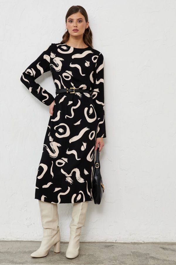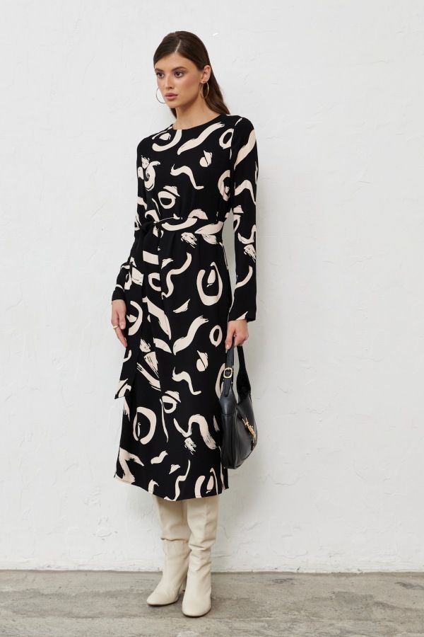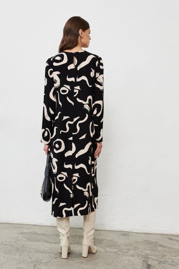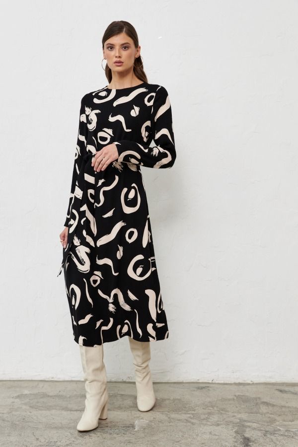 Лаконичное платье из вискозы крепового плетения с оригинальным абстрактным принтом. Модель прямого силуэта. Втачной прямой рукав. По спинке разрез. В комплекте пояс из основной ткани.