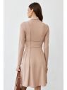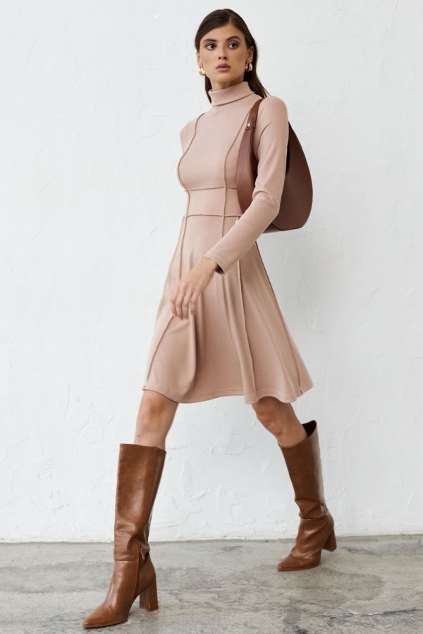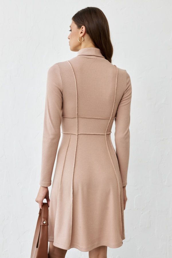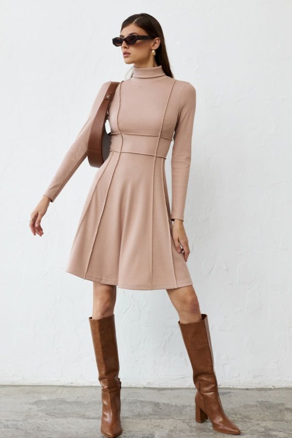Трендовое платье из трикотажного полотна. Модель прилегающего силуэта, юбка расклешеная. Воротник стойка. Рукав втачной, длинный. По переду и спинке декоративные рельефы.