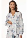 Платье длины миди из воздушной вискозы с переливом. Спереди декоративный запах, отрезное по талии и на резинке. Рукав длинный, втачной, на манжете. Пояс в комплекте.
