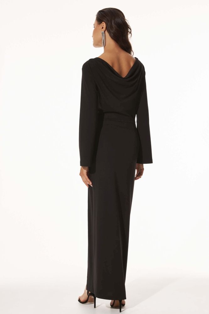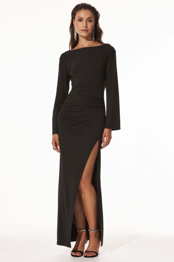 Платье длины макси из трикотажного полотна. Модель прилегающего силуэта. С одной стороны по переду декоративные складки, широкий разрез. По спинке вырез в форме “качели”.