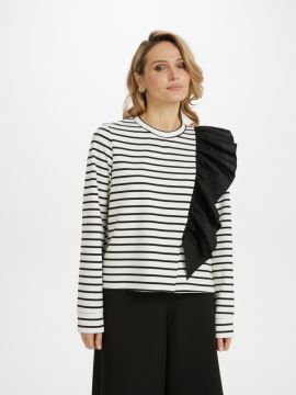 Базовый джемпер в контрастную полосу из кулирной глади. Модель свободного силуэта, рукав втачной. В боковых швах разрезы