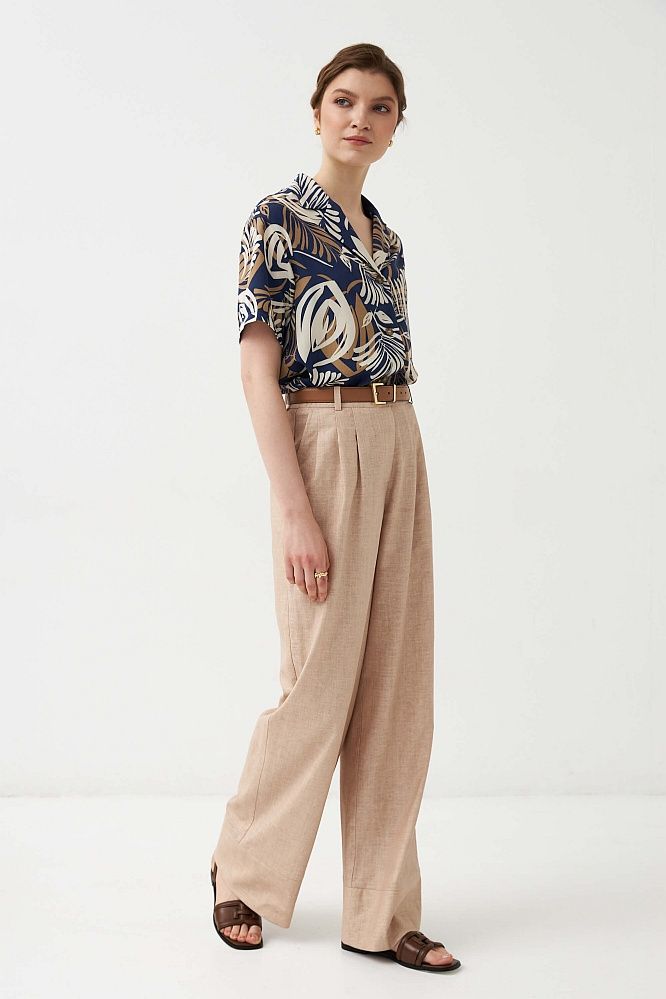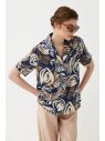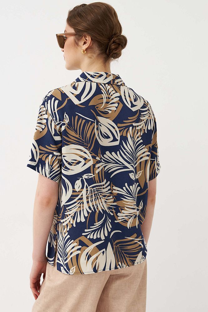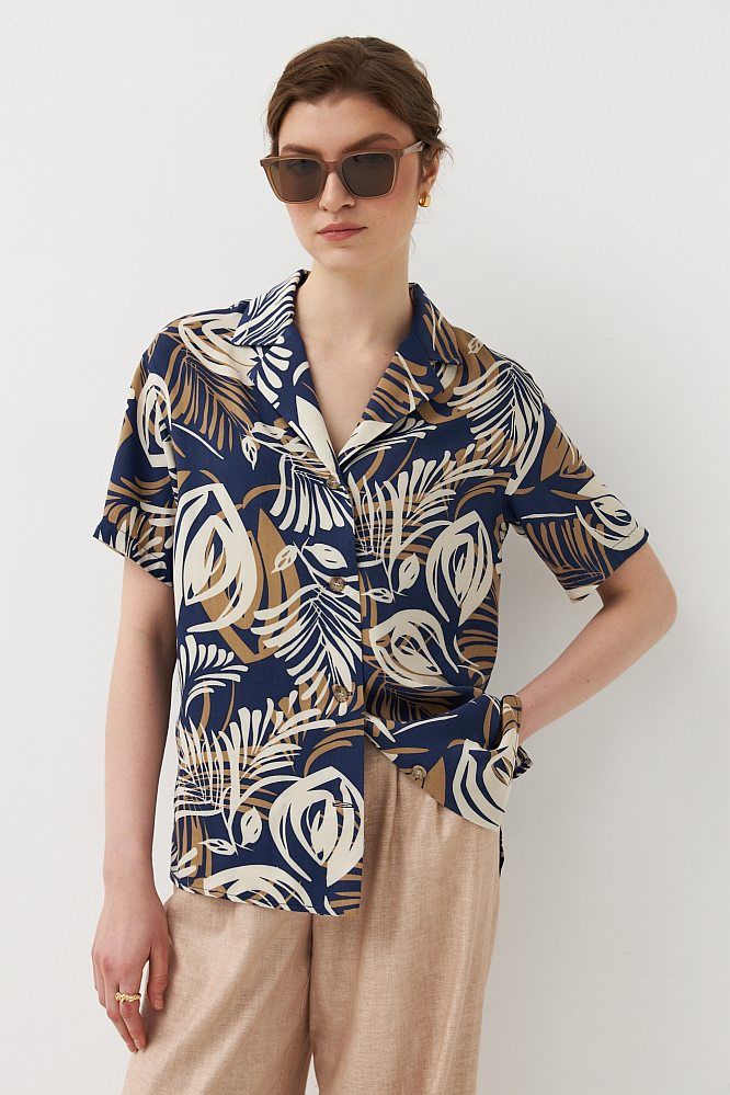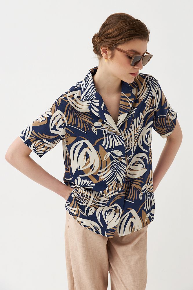 Комфортная блуза- рубашка из вискозного полотна с авторским принтом.Модель свободного силуэта с английским воротником. Рукав короткий. В боковых швах разрезы.Застежка на петли и пуговицы.