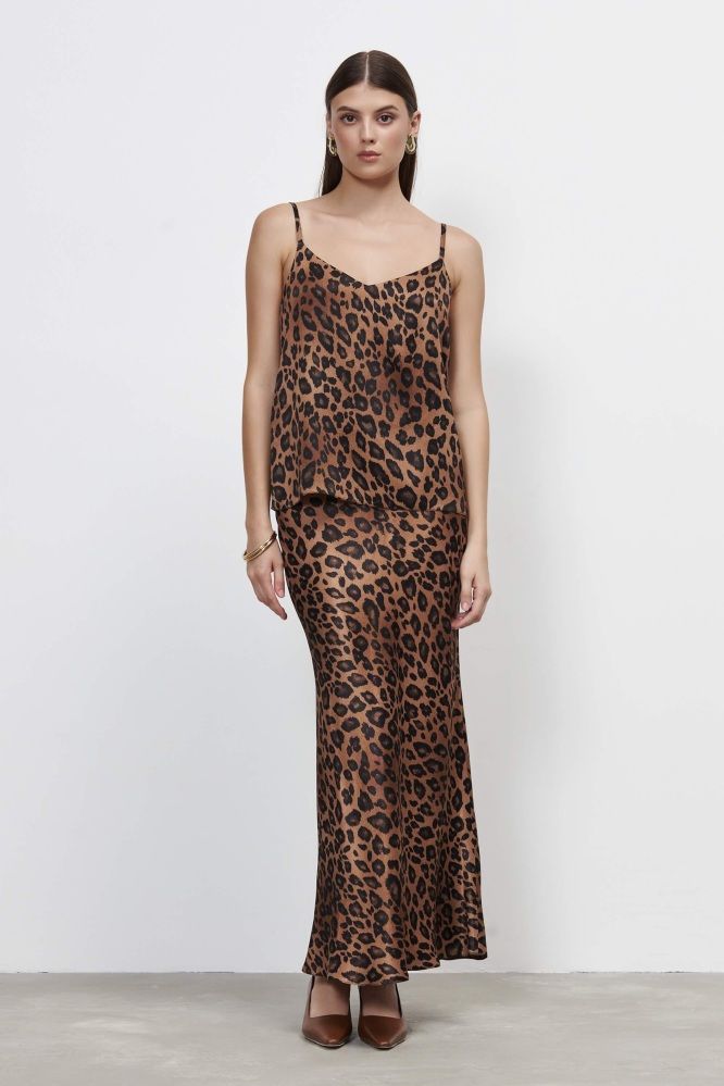Топ из вискозного атласа с анималистическим принтом. Модель полуприлегающего силуэта на тонких, регулируемых бретелях. V-образный вырез горловины по переду.