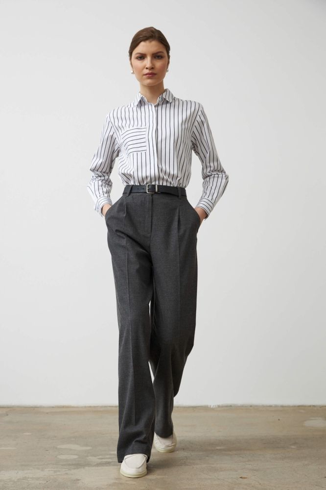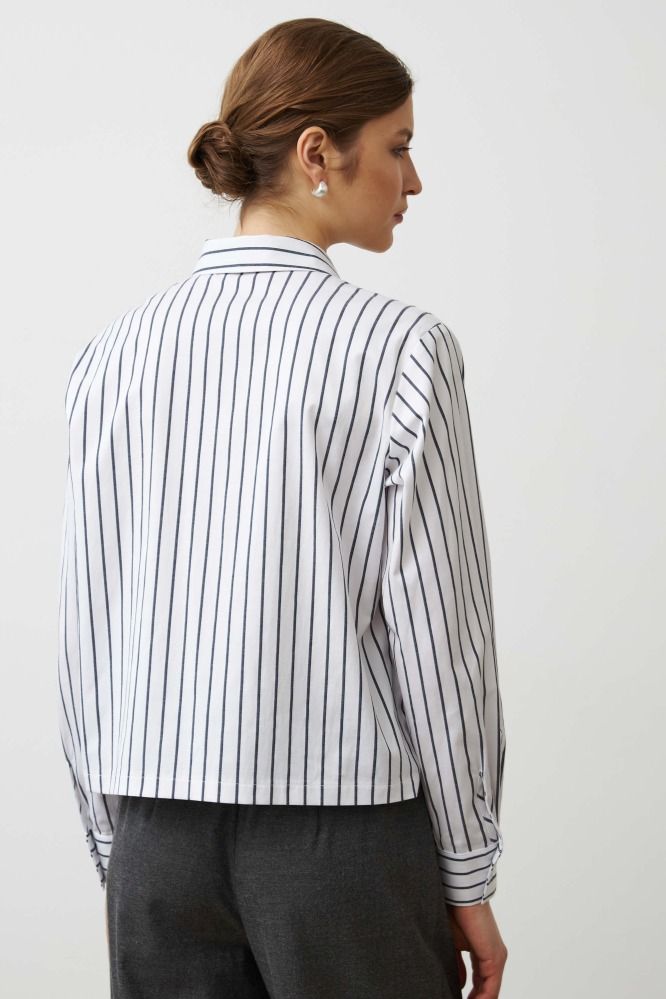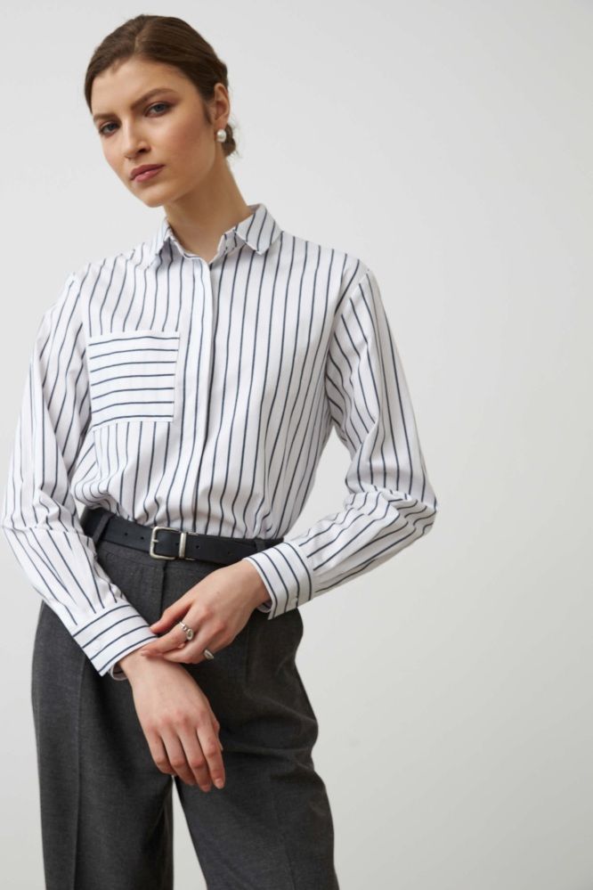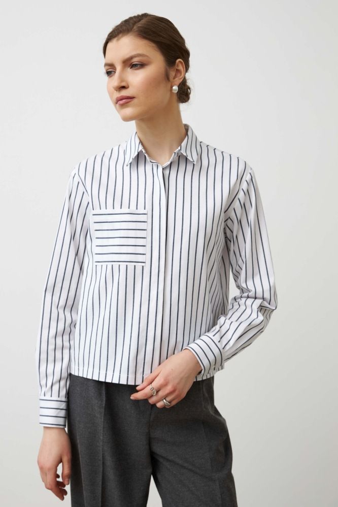 Укороченная рубашка из мягкого хлопка в полоску. Модель свободная, слегка укороченная. Застежка на петлю и пуговицы. Рукав втачной прямой на манжете. Накладной карман на полочке.