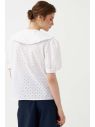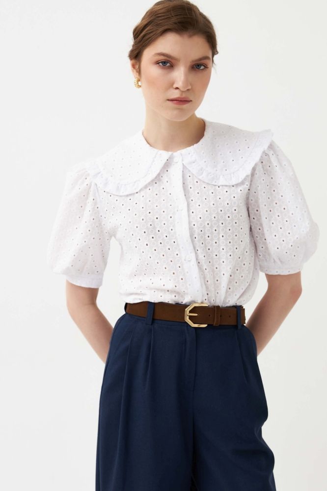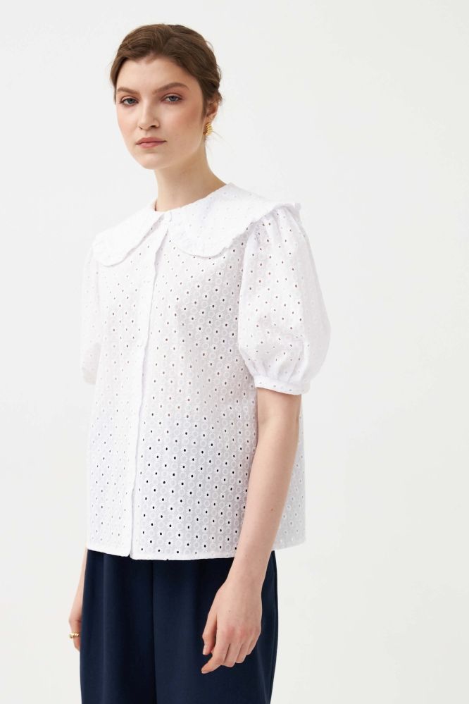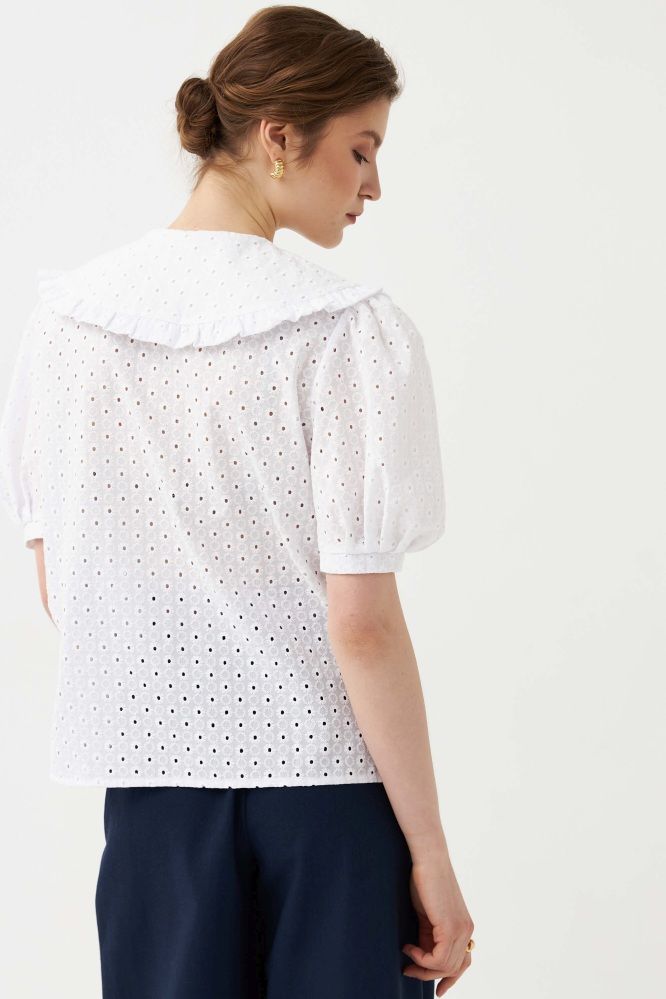 Стильная блуза из хлопкового шитья. Модель прямого силуэта дополнена широким отложным воротником с рюшей. Рукав-фонарик со свободной манжетой по низу. Перед с функциональной застежкой на петли и пуговицы.