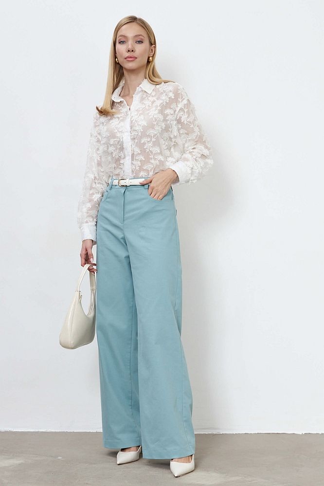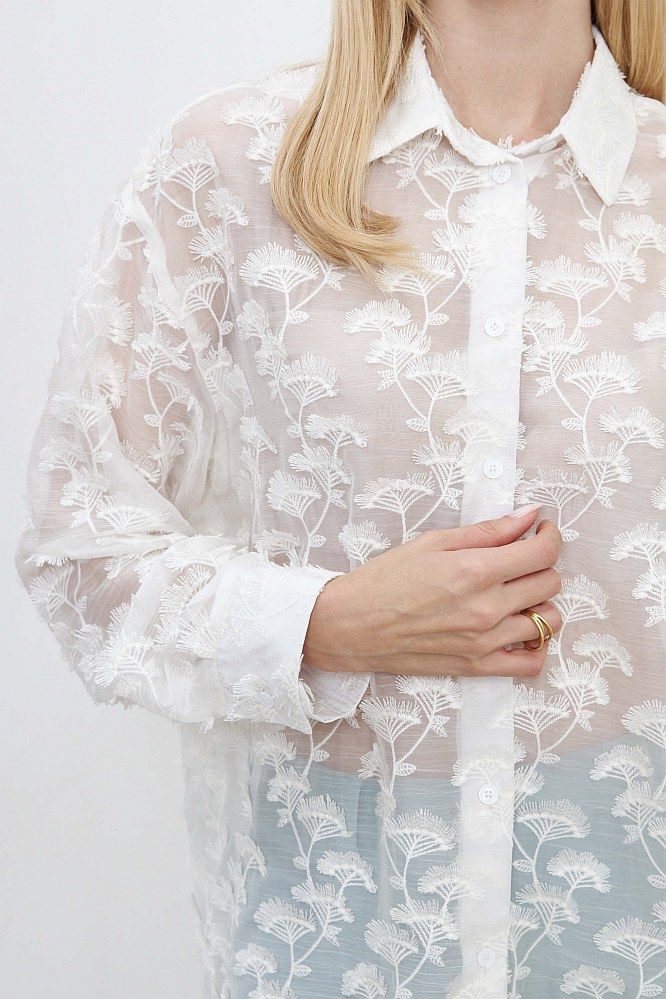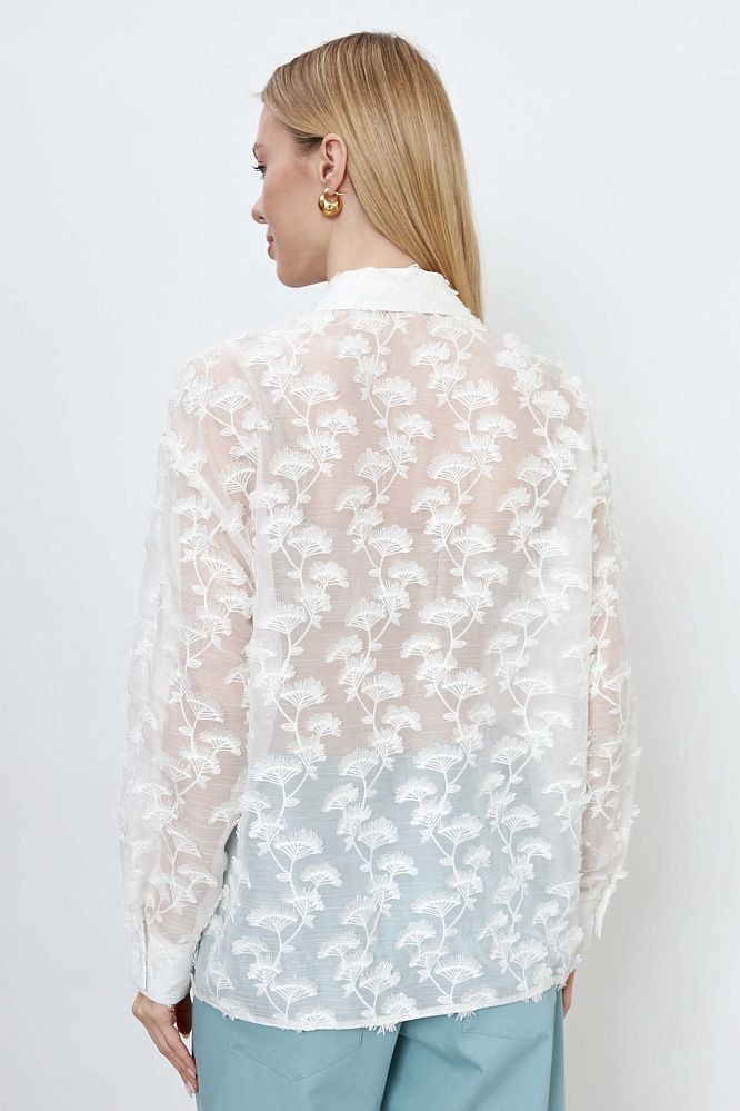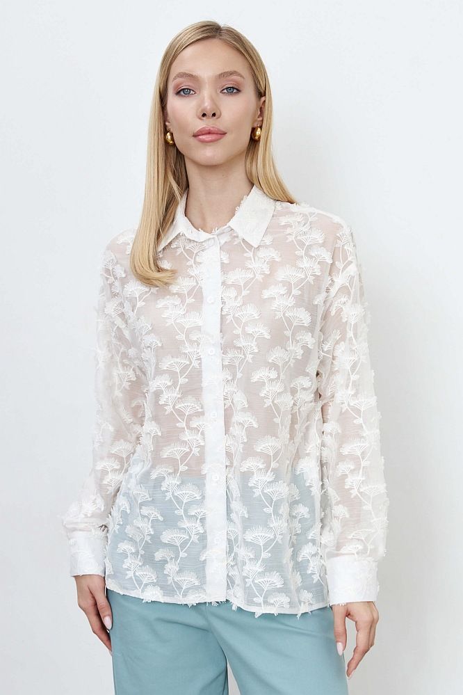 Элегантная блуза-рубашка из премиального шифона с вышитым рисунком. Модель свободного силуэта. По переду функциональная застежка. Рукав свободный с манжетой, застежка на петлю и пуговицу.