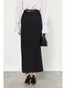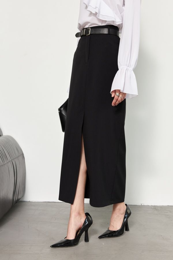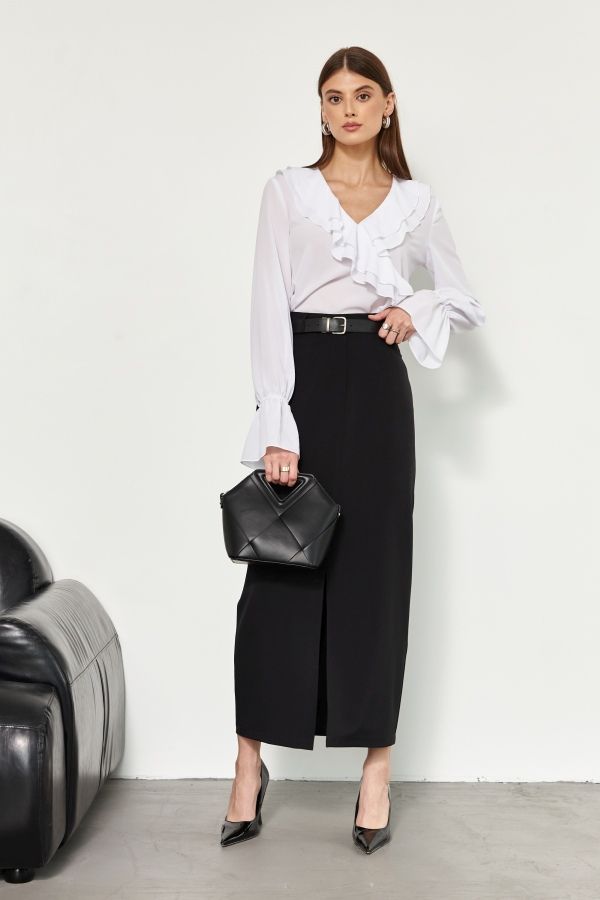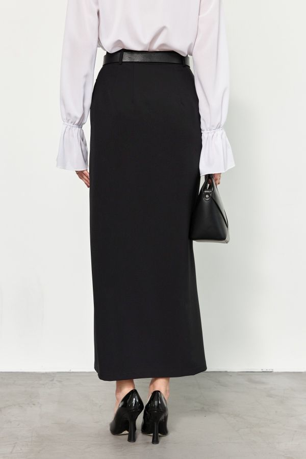 Лаконичная юбка макси из высококачественной костюмной поливискозы. Модель прямого силуэта на притачном поясе. По переду высокая шлица, боковые карманы. Пояс притачной со шлевками. Застежка - гульфик. Изделие на подкладе из поливискозы.