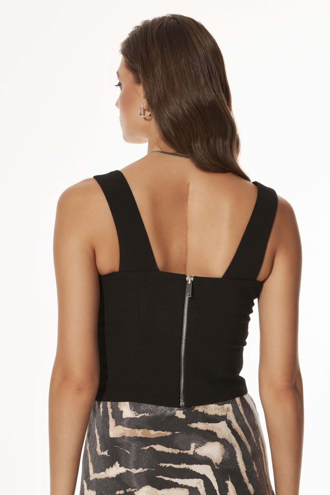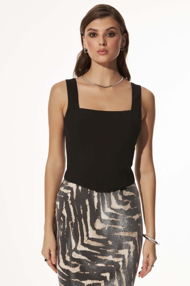 Топ в корсетном стиле из костюмного полотна. По переду и спинке рельефные швы. Низ изделия фигурный. По спинке застежка на металлическую молнию.