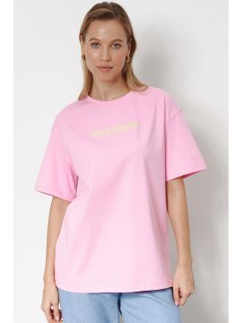 Комфортная футболка с авторским принтом из трикотажного полотна. Модель свободного силуэта. Рукав короткий. Горловина обработана бейкой.