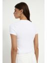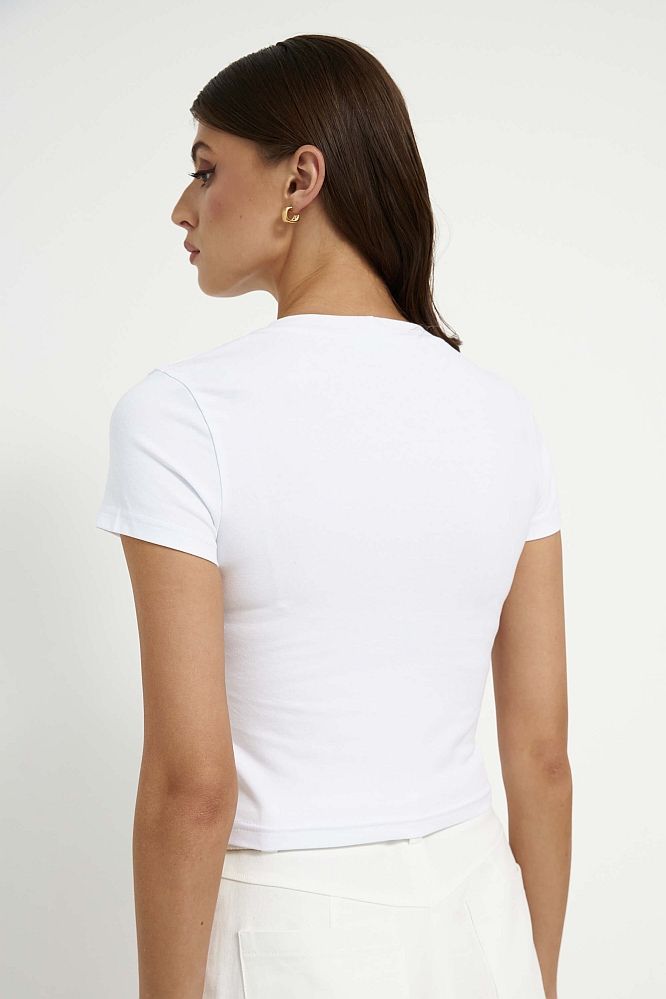 Трендовая укороченная футболка из хлопкового полотна с эластаном. Модель прилегающая, рукав втачной короткий. Авторский принт. По горловине бейка из основной ткани.