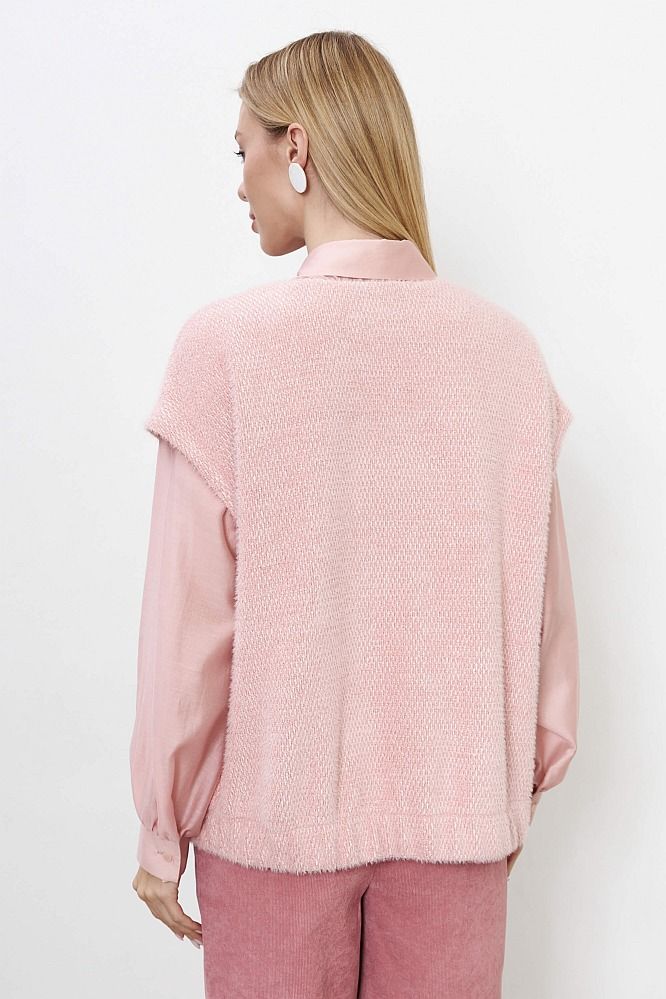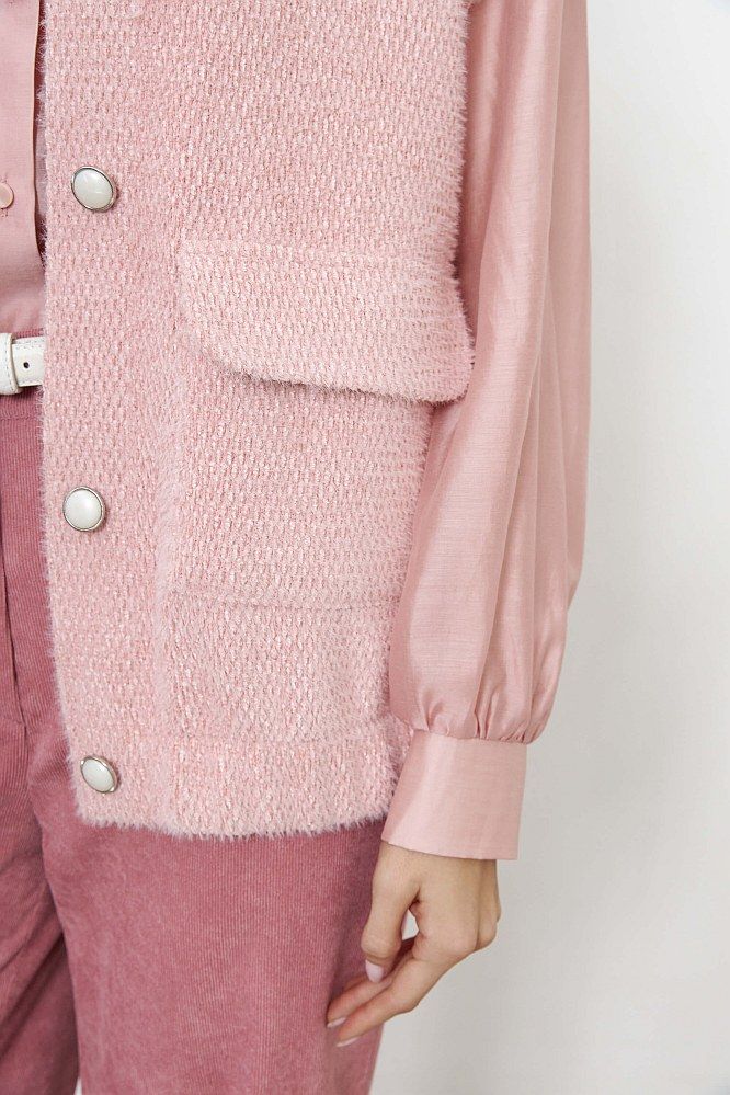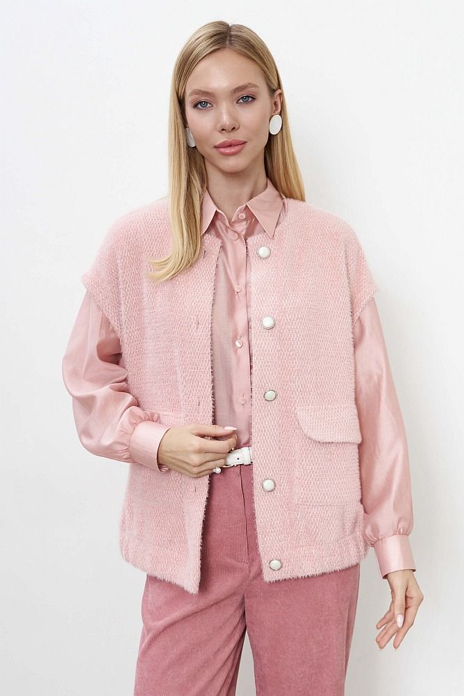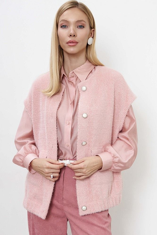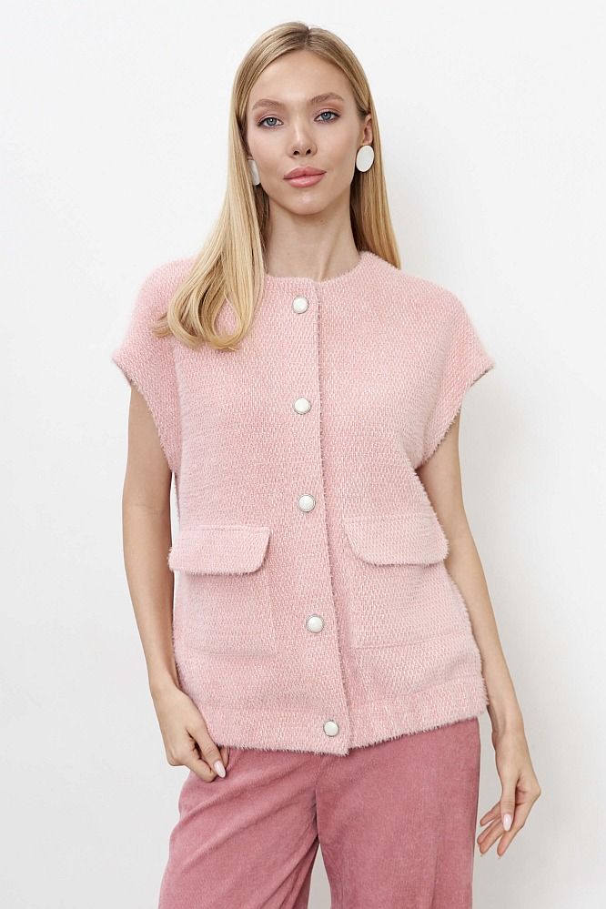 Уютный жилет с акцентными пуговицами. Модель свободного силуэта со спущенным плечом и декоративной резинкой по низу. По переду застежка на петли и пуговицы, функциональные накладные карманы.