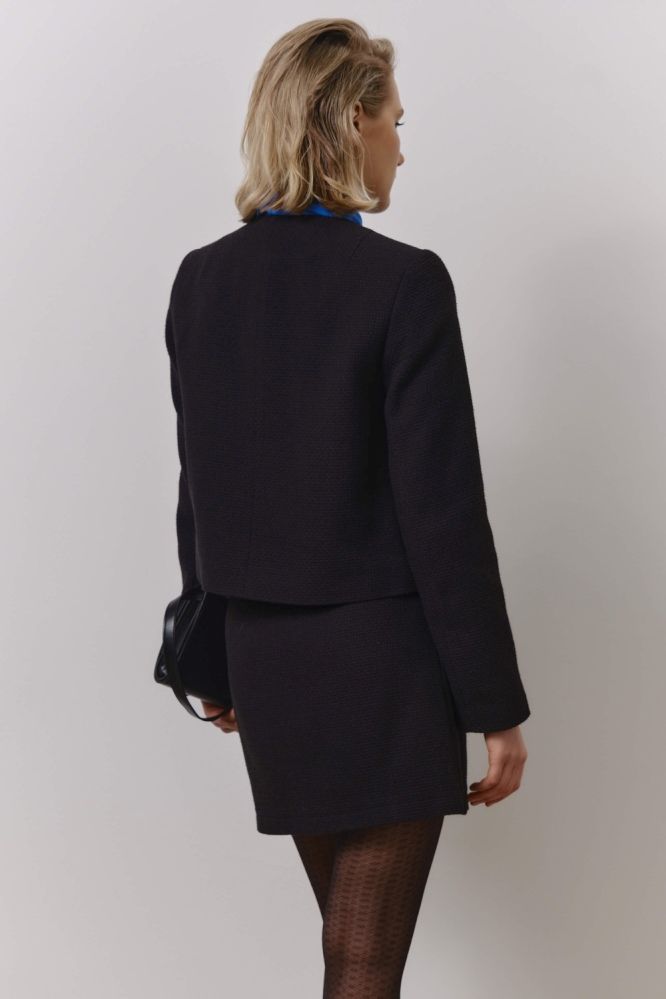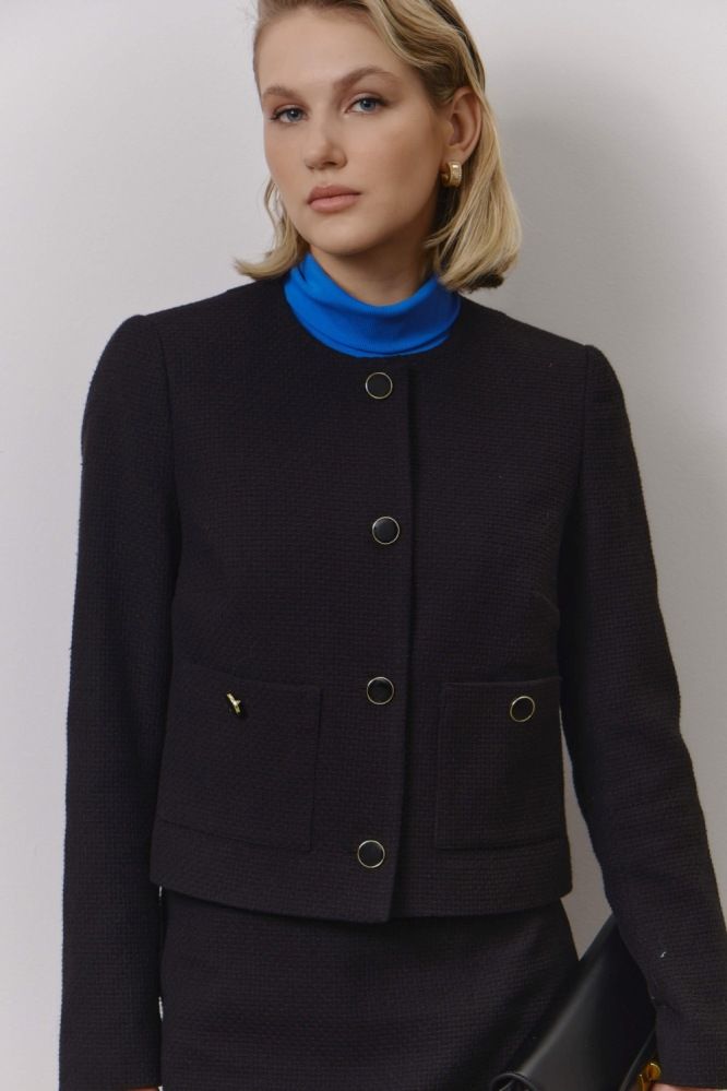 Жакет из твидового полотна для любого случая. Модель прямого силуэта. Рукав втачной, застёжка на петли и пуговицы. Изделие на подкладке из поливискозы.