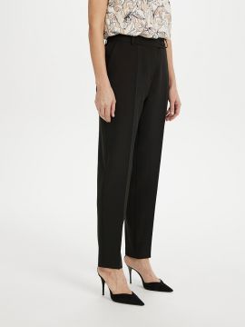 Комфортные брюки из костюмной поливискозы. Модель заужена к низу, на притачном поясе. По спинке эластичная резинка для комфортной посадки. По переду боковые карманы, стрелки. Застежка на молнию.