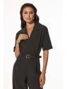 Комбинезон из костюмной поливискозы в графитовом оттенке. Модель приталенная, рукав цельнокроенный укороченный прямой. Воротник английский на запахе. Низ изделия свободный прямой, карманы.